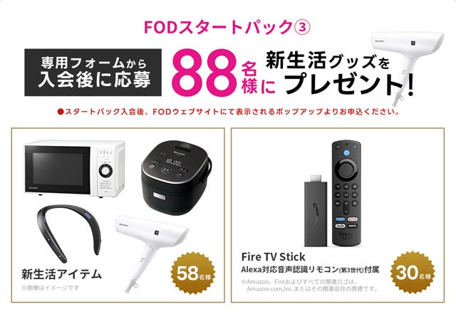 キャンペーン期間中、「新生活応援FODスタートパック」に新規入会し、専用のフォームから応募すると、電子レンジ、ドライヤー、炊飯器のほか動画を視聴する時間がより楽しくなるFire TV Stickなど、新生活にぴったりなグッズが抽選で合計88名に当たります。