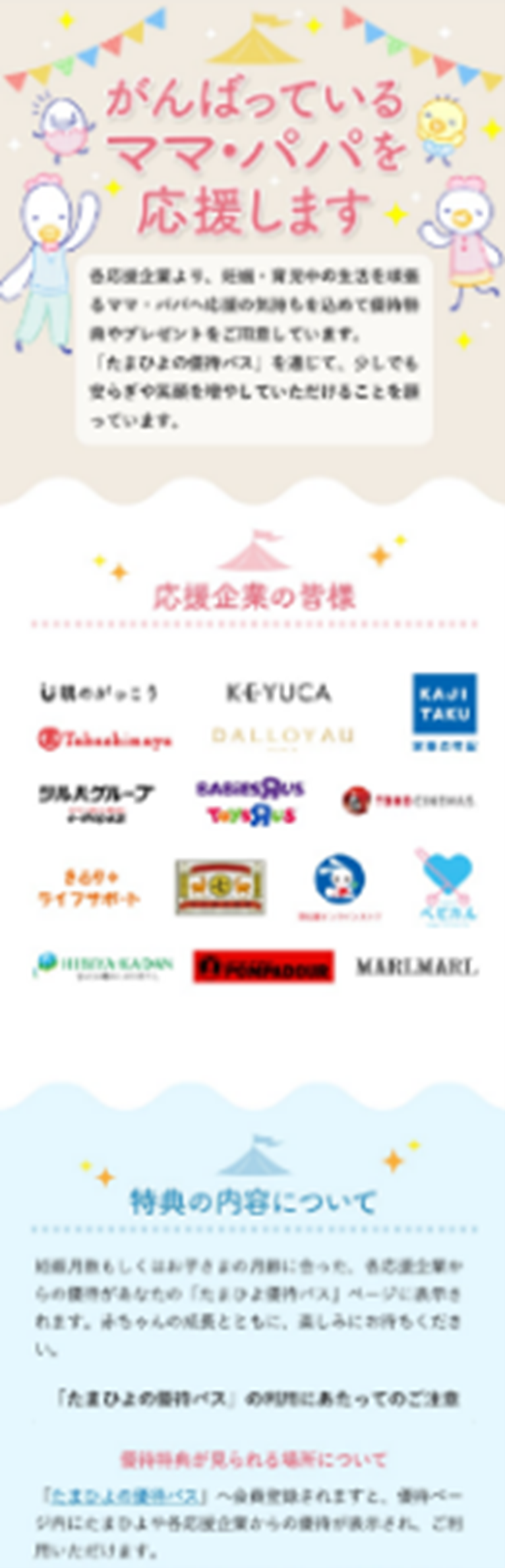 このたび、新たに「たまひよの優待パス」サービスを開始し、毎月たまひよ限定のステキな優待を、ママ・パパを応援する企業の方々とともにお届けいたします。