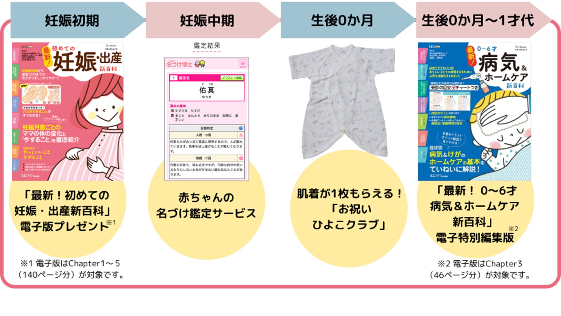 たまひよの内祝や、『最新!妊娠・出産新百科』、『最新!0~6才 病気&ホームケア新百科』などのムック試読サービス、こどもちゃれんじといったベネッセのサービスも含まれます。誕生したばかりの赤ちゃんの成長に寄り添ったサービスの優待特典が登場します。