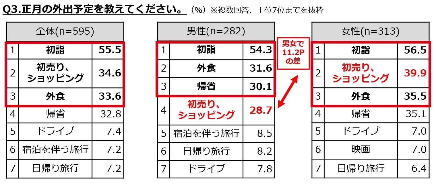 ・外出予定は「初詣」が半数以上で最も高く、以下「初売り、ショッピング」「外食」「帰省」が3割台。「初売り、ショッピング」は男女で1割程度の差あり。