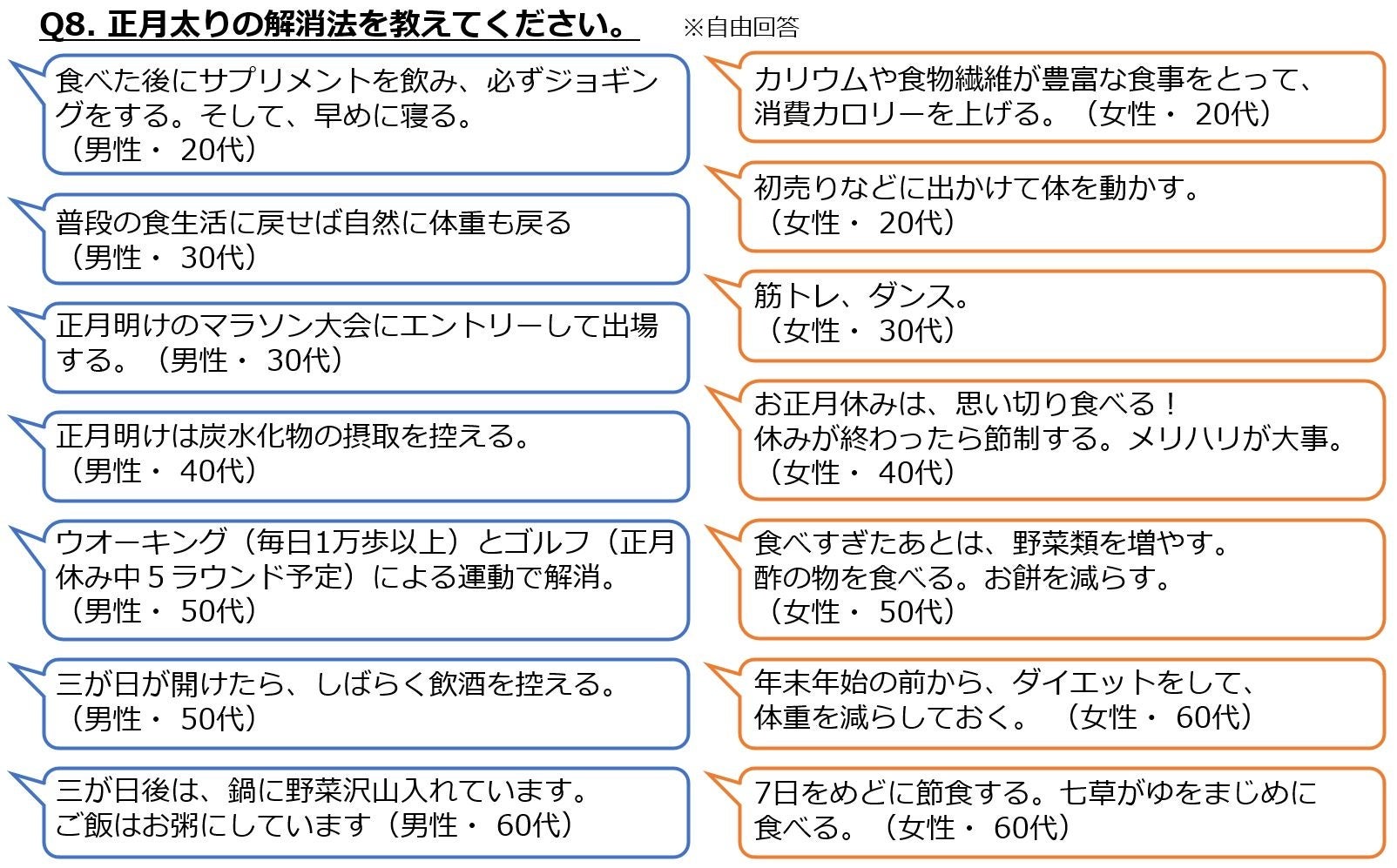ところで、自宅でも「ご馳走」が食卓に並ぶ機会が多いお正月ですが、食べ過ぎなどが原因で「正月太り」をすることがある方は約7割。その方々に「正月太り」の解消法をたずねると、サプリや運動や食事制限など様々な方法があげられましたが、解消法と一緒に「正月明け」や「三が日が開けたら」、「休みが終わったら」、「年末年始の前に」という言葉も多くあげられていました。様々な解消法の用意はありますが、お正月中は忘れて美味しいものを心置きなく楽しむ予定の方が多いようです。