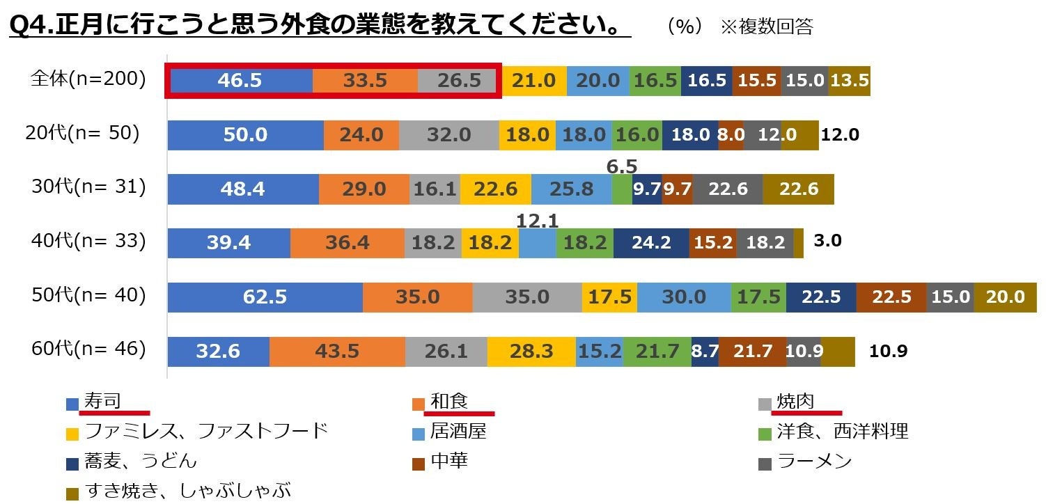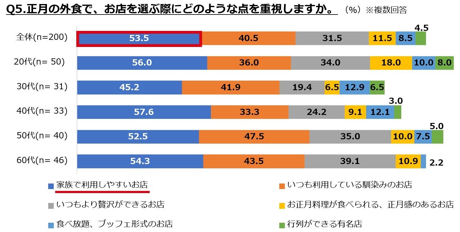 外出の予定をたずねると、初詣の次に「初売り、ショッピング」「外食」が3割台で続きました。正月の外食では「家族で利用しやすいお店」を重視する方が5割以上で、新年はまず、家族揃って外食に行こうと考える様子がうかがえました。