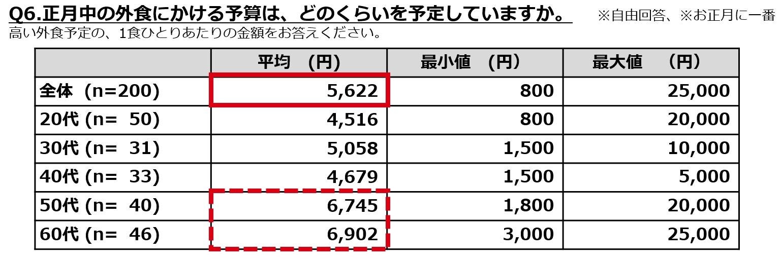 ・正月の外食の平均予算は5,622円で、50~60代は7,000円弱。