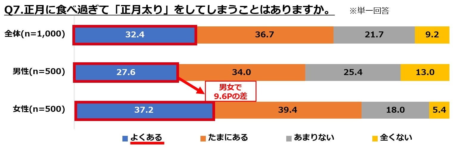 ・正月太りは「よくある」「たまにある」を合わせると7割。男性より女性が正月太りしやすい傾向。