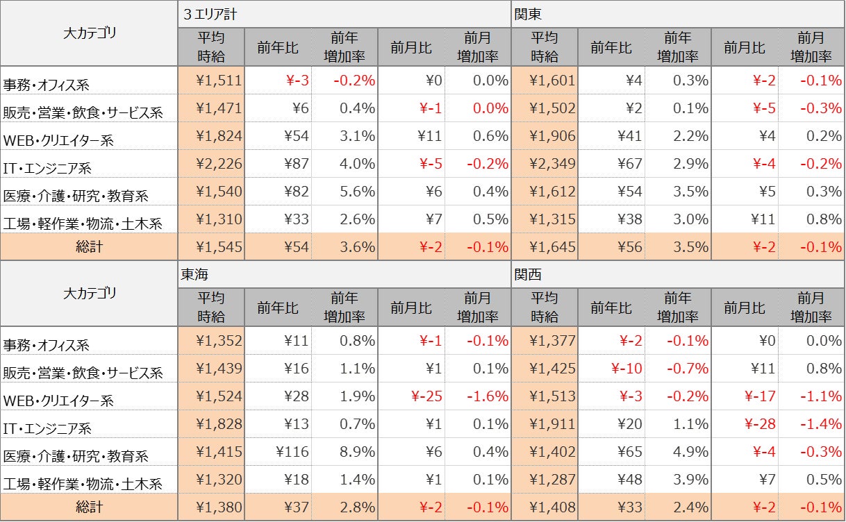 エリア別の平均時給について、関東エリアは1,645円(前年比56円増、前月比2円減)、東海エリアは1,380円(前年比37円増、前月比2円減)、関西エリアは1,408円(前年比33円増、前月比2円減)となりました。