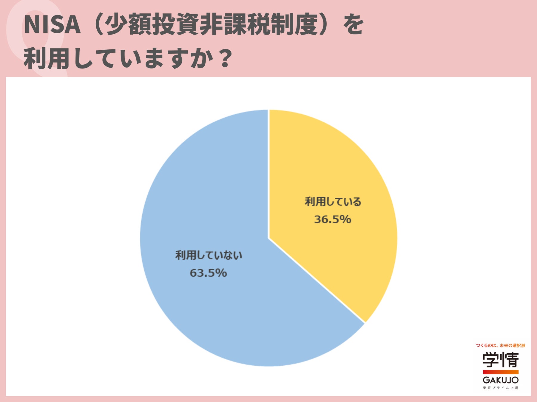 NISA(少額投資非課税制度)について、「利用している」と回答した20代は36.5 %でした。利用者からは、「少額から投資でき、非課税なので気軽に始められた」「ニュースで見聞きすることが多いため、最近利用し始めた」といった声が上がっています。非利用者からは、「興味はあるものの、やり方を十分に理解できていないため実際に利用はしていない」「リスクも伴うので、きちんと情報収集をしてから始めたい」「投資を始めるのに必要な貯蓄がない」などの声が寄せられました。