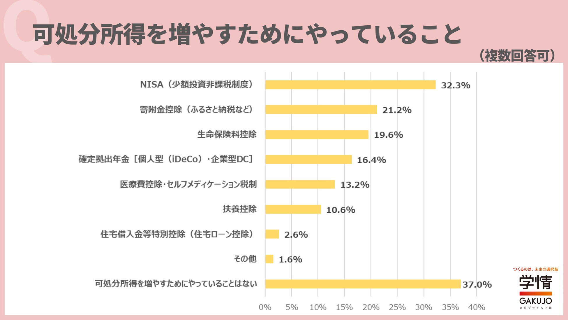 可処分所得を増やすためにやっていることは、「NISA(少額投資非課税制度)」が32.3%で最多。次いで、「寄附金控除(ふるさと納税など)」21.2%、「生命保険料控除」19.6%、「確定拠出年金[個人型(iDeCo)・企業型DC]」16.4%が続きました。
