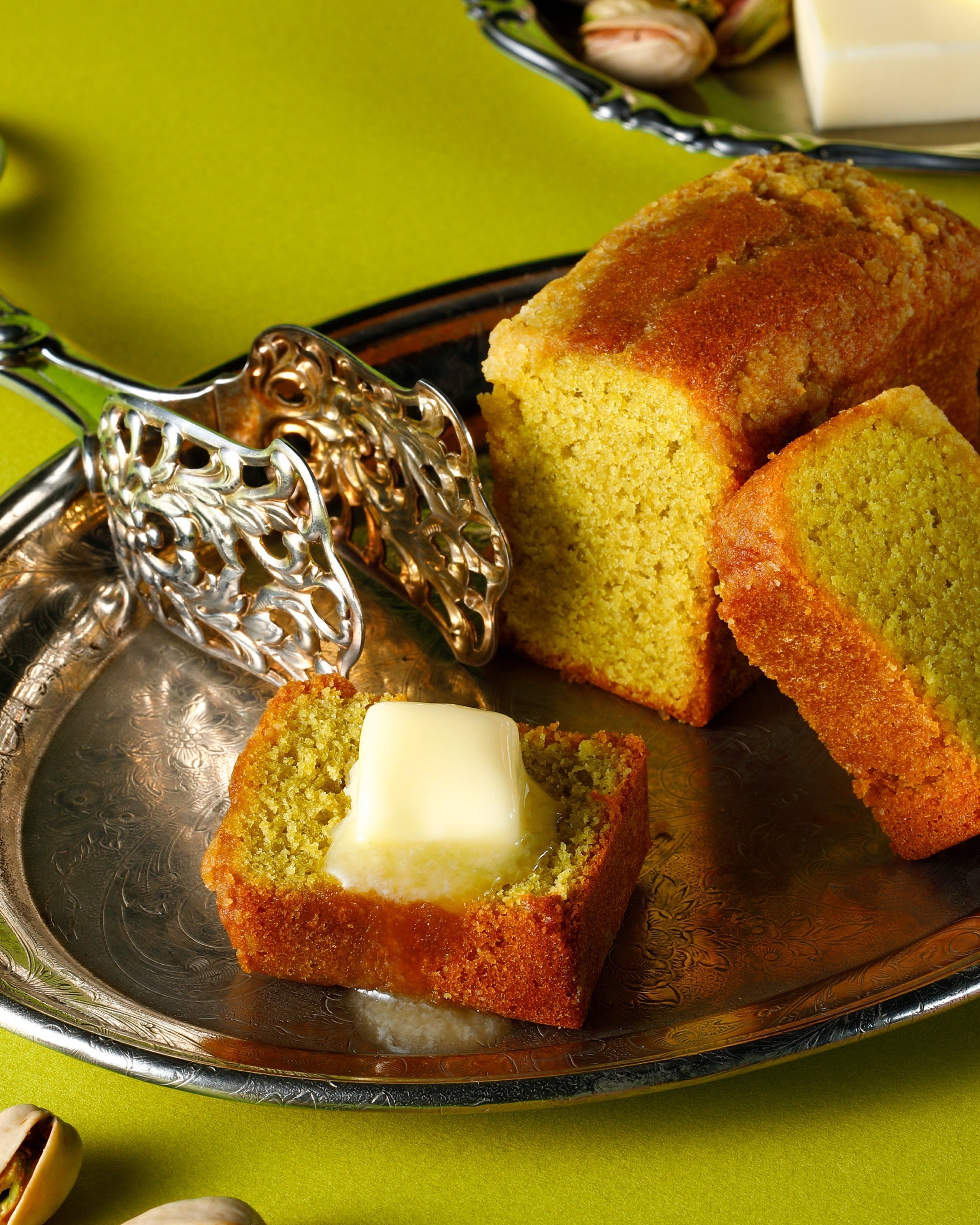 グラスフェッドバター(※)とピスタチオペーストを生地に練り込み、しっとりと焼き上げた「バターピスタチオケーキ」。やさしく広がるピスタチオの香り、まろやかさとコクが引き立つなめらかな生地に、トッピングされたほんのり塩味のシュトロイゼルがアクセントを添えます。ふんわりとした口あたりと、シュトロイゼルの食感が重なり合い、上品な余韻を演出します。
