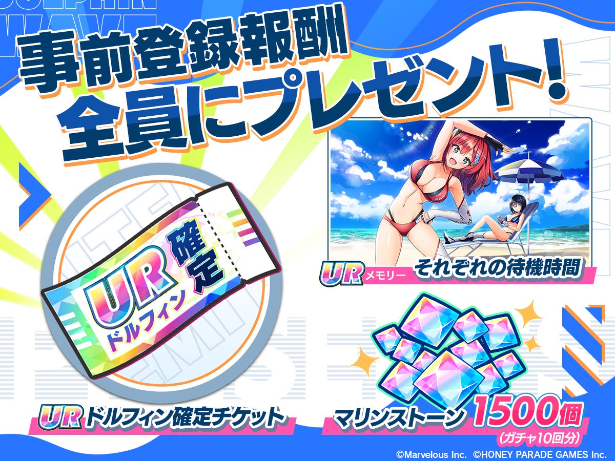 事前登録報酬として、最高レアのドルフィンが確実に入手できる「URドルフィン確定チケット」と、入華とみちるペアが描かれたURメモリー「それぞれの待機時間」、さらに「マリンストーン1500個」(ガチャ10回分)をゲーム開始時にプレゼントいたします!また、これらの報酬とは別に、チュートリアル時に10回分のガチャを引くことができます。お気に入りのドルフィンと出逢うためにぜひお役立てください!