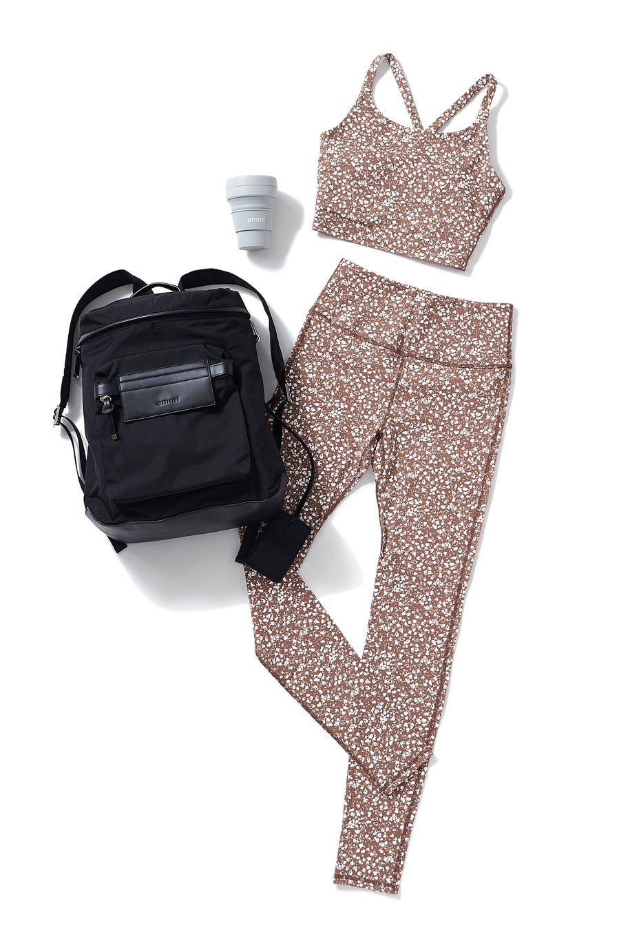 淡いブラウンのカラーリングがお洒落なミニフラワー柄のブラトップとレギンスのセットに、