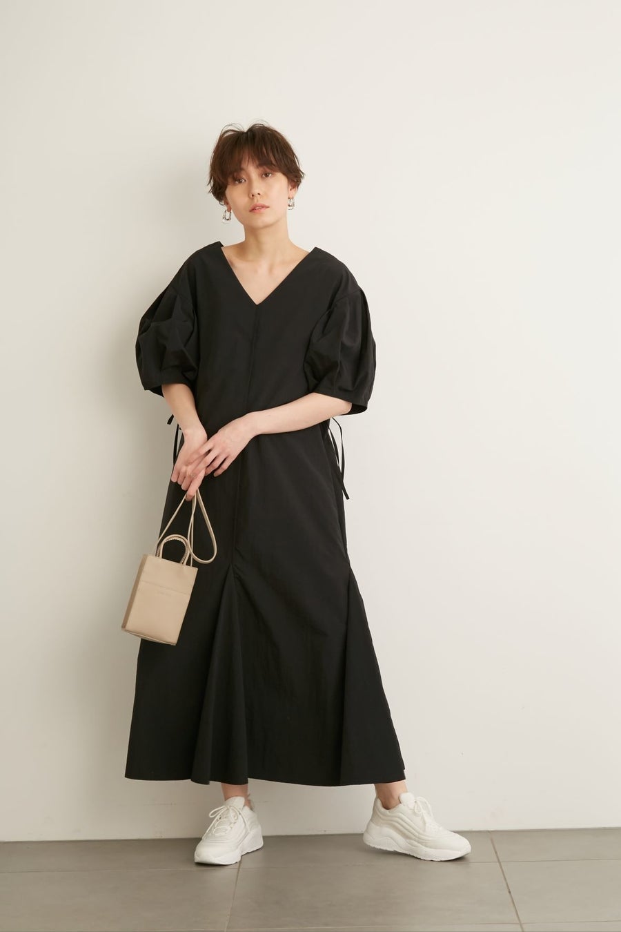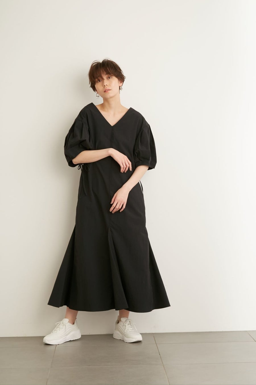 袖口のドローストリングによってギャザーを作れる袖は、リラックス感がありつつも華やかな雰囲気を演出。