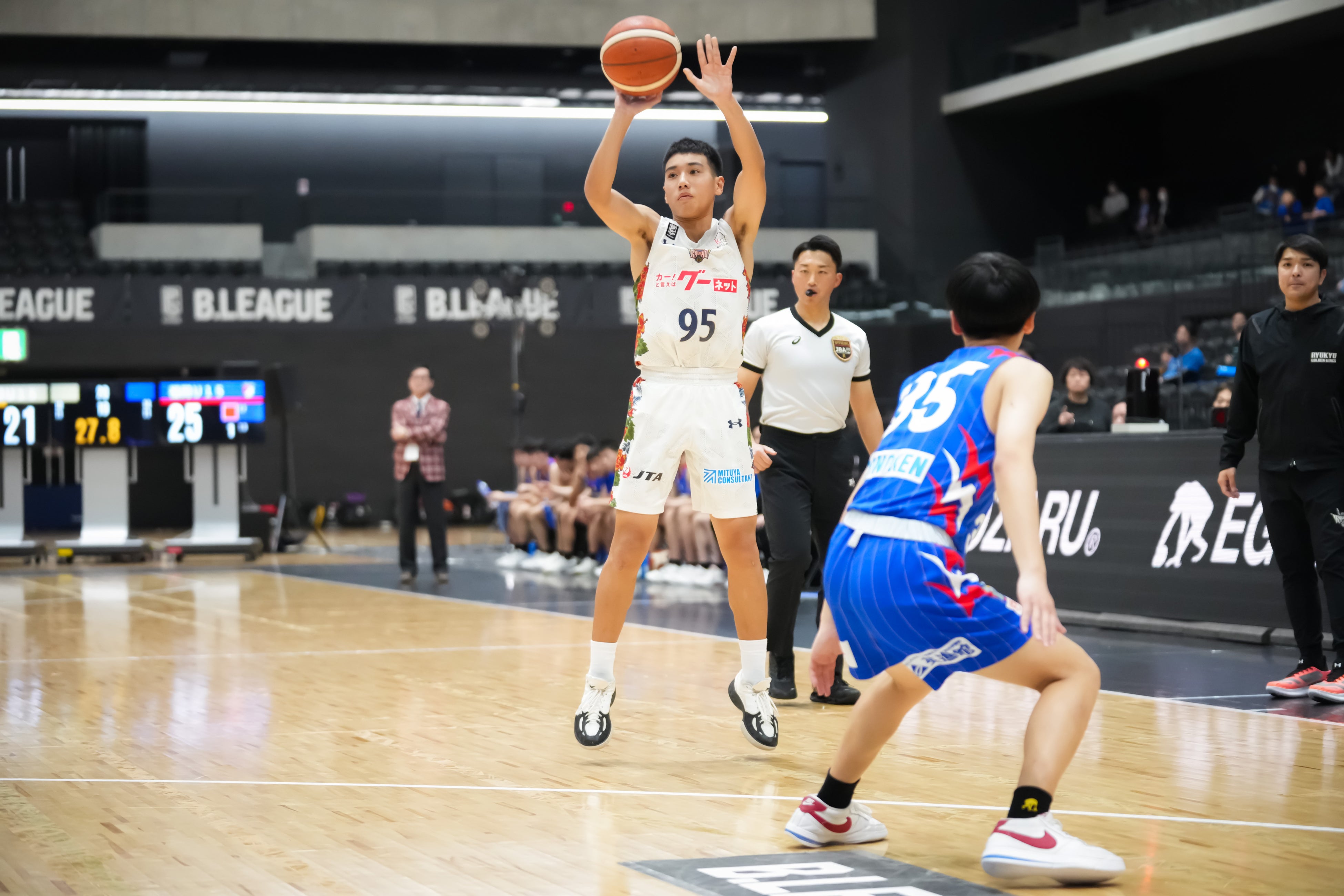 前回大会と同じ顔合わせとなった福岡U15との決勝戦。キングスU15は、#18 宮城選手や#12 大城選手が精度の高いミドルショットを沈めて食らいつきますが、平均身長180.3cmを誇る福岡U15のフィジカルと高さを活かした攻守に苦戦を強いられ、21-28で前半を折り返します。しかし後半は一丸となったディフェンスで相手の得点を阻み、#95 川満佑絃選手の果敢なペイントアタックや#37 金城大智選手の要所での3Pシュートなどで奮闘。チームで掲げる「超高速バスケ」を貫き、60-49で勝利を掴み取りました。