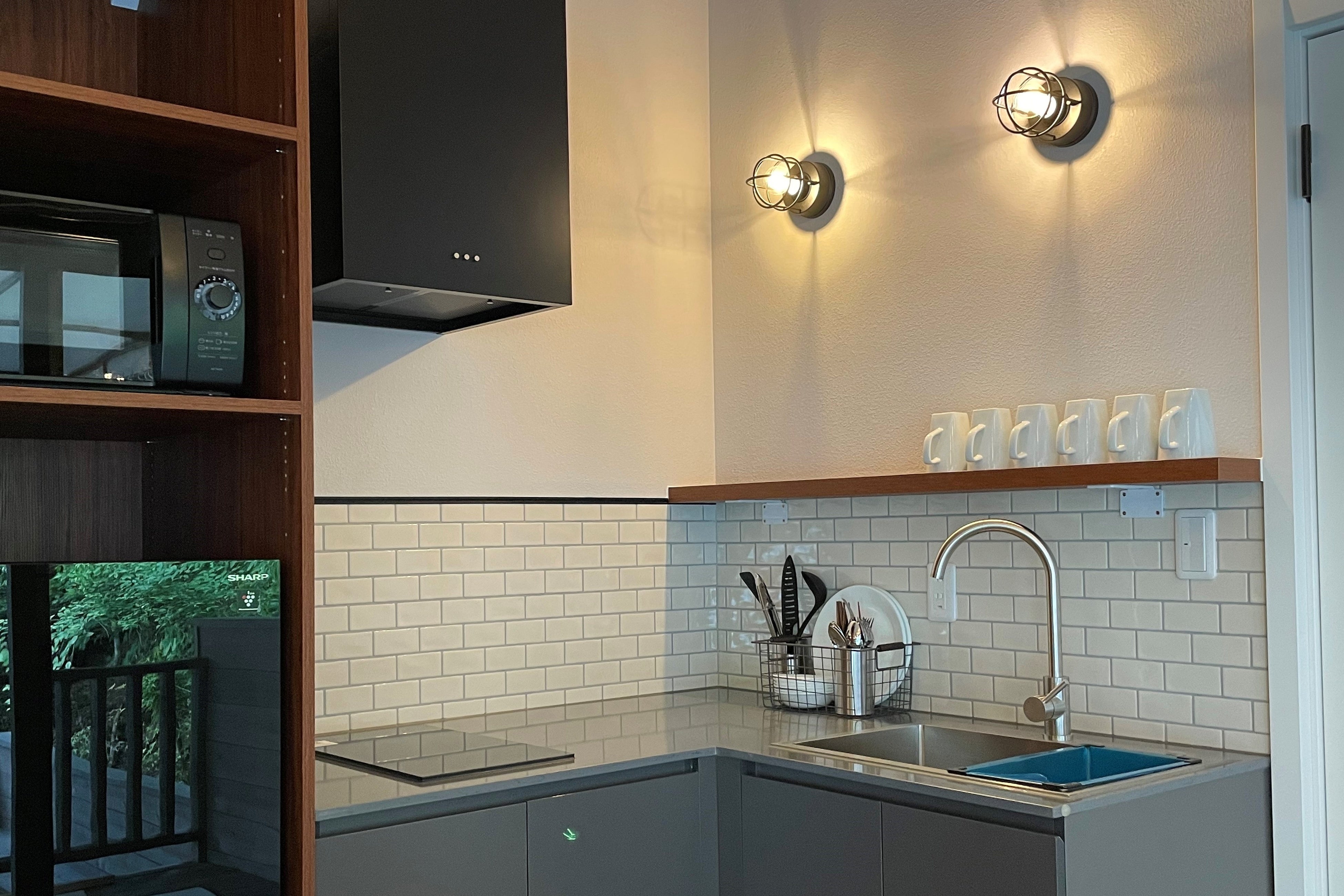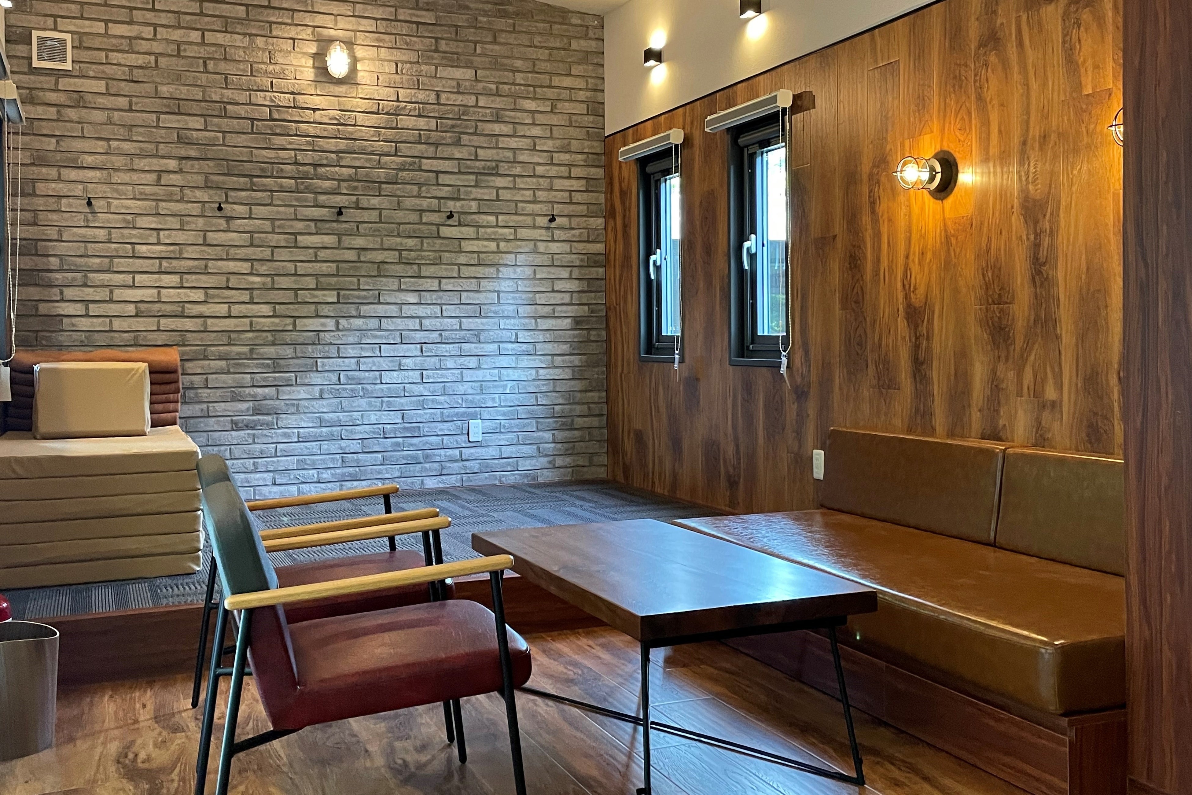 「“焚火”を楽しむ大人のキャンプ」をコンセプトに造られたトレーラーコテージ「Fire Base・TAKIBI」。職人が手作業で丁寧に貼りあわせたPICAリゾート随一の広さを誇る石張りのデッキには、大型のファイヤーピット(焚火台)が備わり、星空のもと焚火を囲みながら落ち着いた時間を満喫していただけます。レンガ調の壁がアクセントのシックな装いの室内で、自然の豊かさを感じながらお過ごしいただくのもおすすめです。