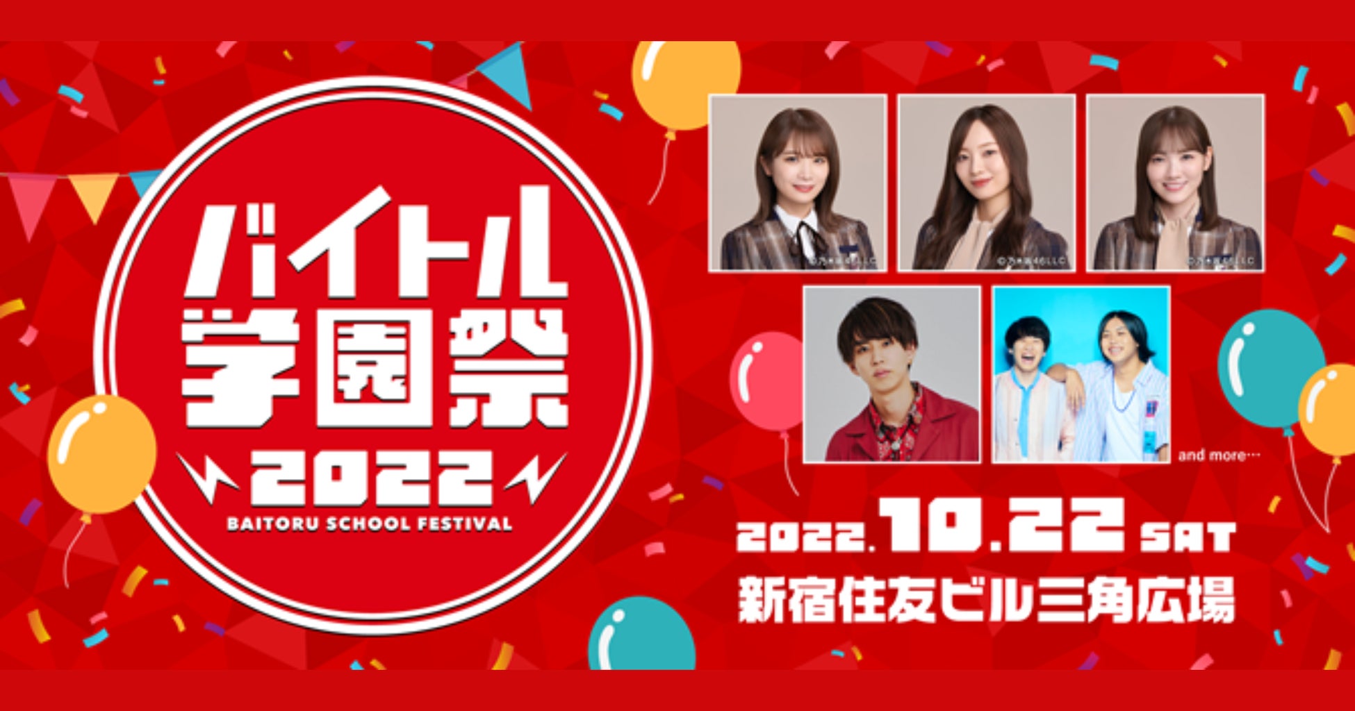 ディップ株式会社(以下、「当社」)は、アルバイト・パート求人情報サイト「バイトル」の20周年を記念して、「乃木坂46」の秋元真夏さん、梅澤美波さん、田村真佑さんや、人気動画クリエイターのはじめしゃちょーさん、水溜りボンドさんを始めとする豪華メンバーが登場するバイトル学園祭2022を、2022年10月22日(土)に新宿区西新宿の新宿住友ビル三角広場で開催し、810名を無料でご招待します。本日、9月26日(月)より募集開始します。