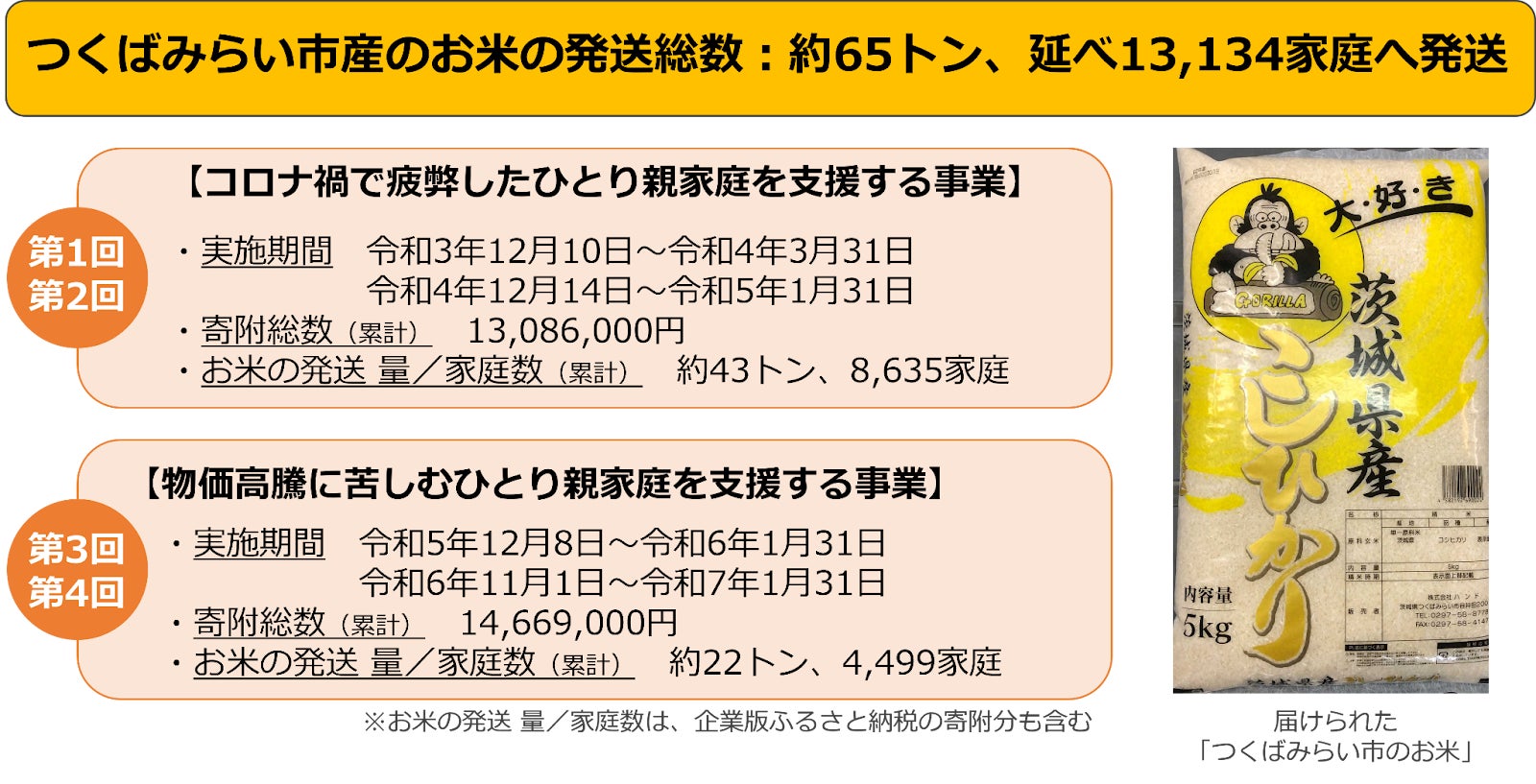 これまでに、企業版ふるさと納税の寄附及び、4年にわたり続けてきたひとり親支援事業に関するふるなびクラウドファンディングで集まった寄附金によって収穫された「つくばみらい市産米」累計【約65トンのお米】を、NPO法人しんぐるまざあず・ふぉーらむが支援する延べ【13,134家庭のひとり親家庭】に向けて発送が完了した事となります。