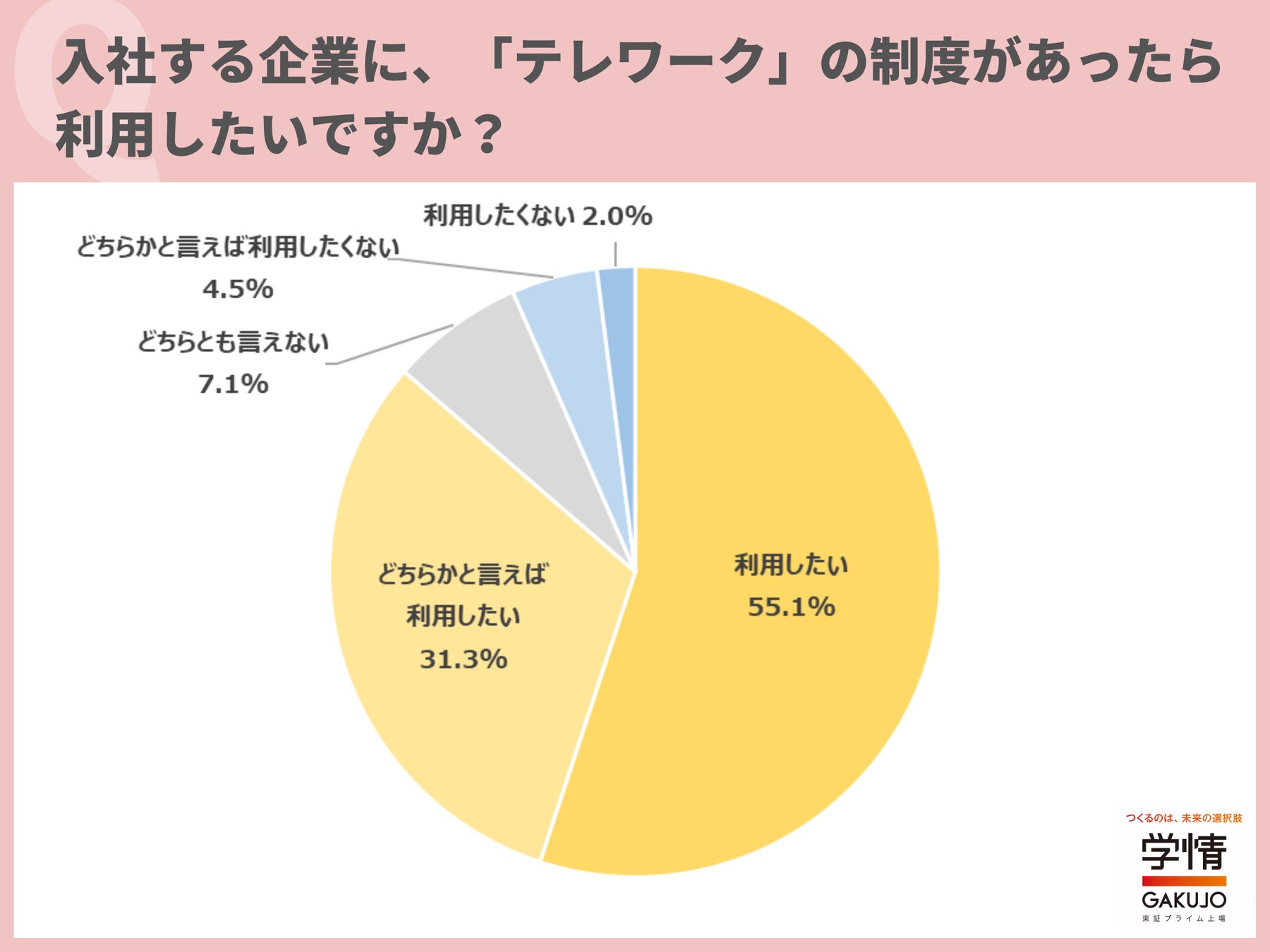 入社する企業に「テレワーク」の制度があったら「利用したい」と回答した新社会人が55.1%に上りました。「どちらかと言えば利用したい」31.3%を合わせると、8割以上の新社会人がテレワークの制度を利用したいとしています。「業務に慣れてきたら、テレワークも活用したい」「通勤時間を削減し、時間を有効活用したい」「朝の時間を有効活用できるのは魅力的だと思う」「個人作業の場合はテレワークのほうが集中できると思う」などの声が上がりました。