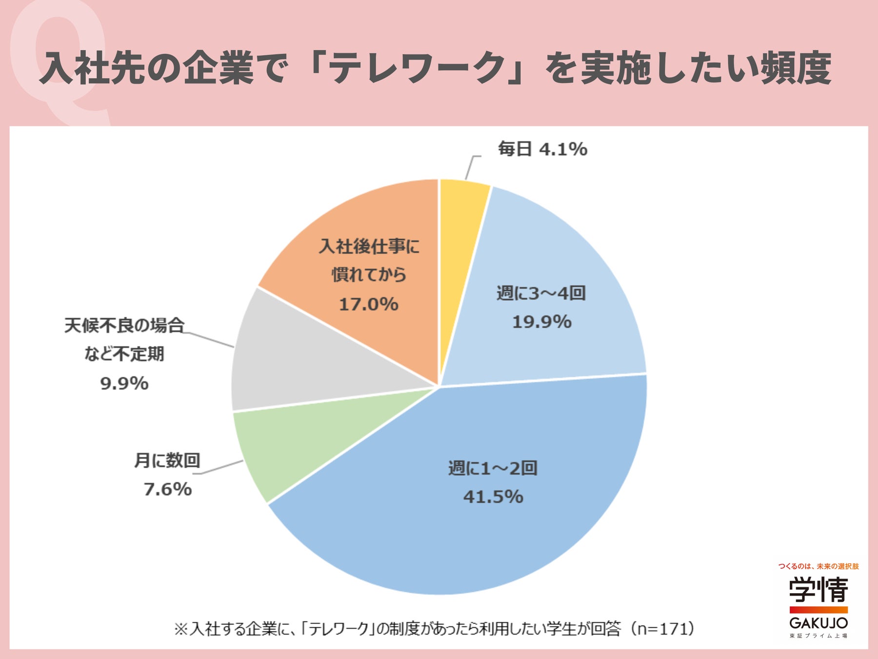 入社先の企業で「テレワーク」を実施したい頻度は、「週に1~2回」が41.5%で最多となりました。次いで、「週に3~4回」19.9%、「入社後仕事に慣れてから」17.0%が続きました。