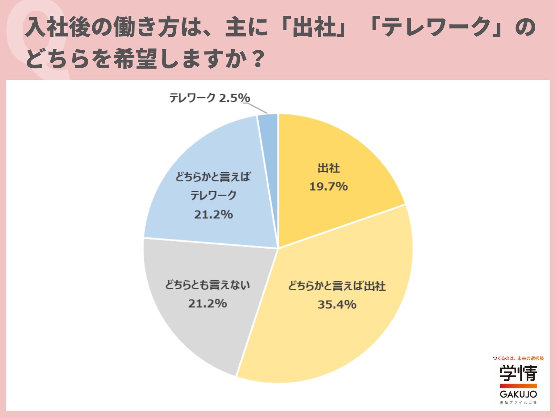 出社後の働き方は、「出社」を希望する新社会人が19.7%に上りました。「どちらかと言えば出社」35.4%を合わせると、「出社」を希望している新社会人が6割に迫ります。