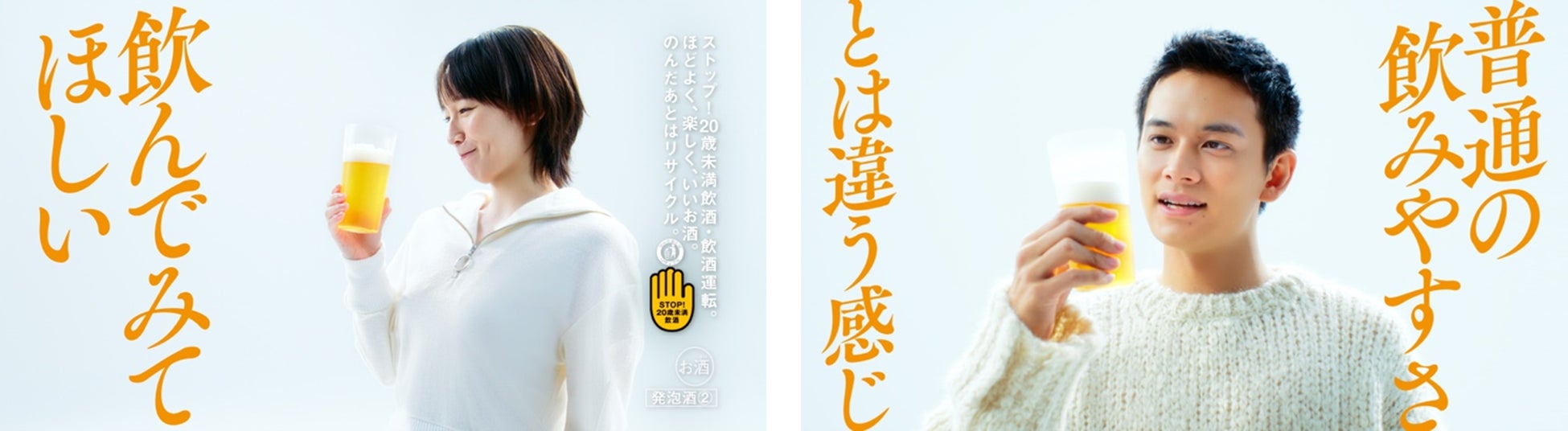 「飲みやすくておいしいのが、いちばん。」篇は、吉岡さんと北村さんが「いただきます」と言いながら『クリアアサヒ』を口にするシーンから始まります。吉岡さんの「騙されたと思って飲んでみてほしい」、北村さんの「よく言う普通の飲みやすさとは結構違う感じ」というコメントと『クリアアサヒ』をおいしそうに飲む二人の姿を通じて「飲みやすくておいしい。」という『クリアアサヒ』の独自価値を訴求しています。