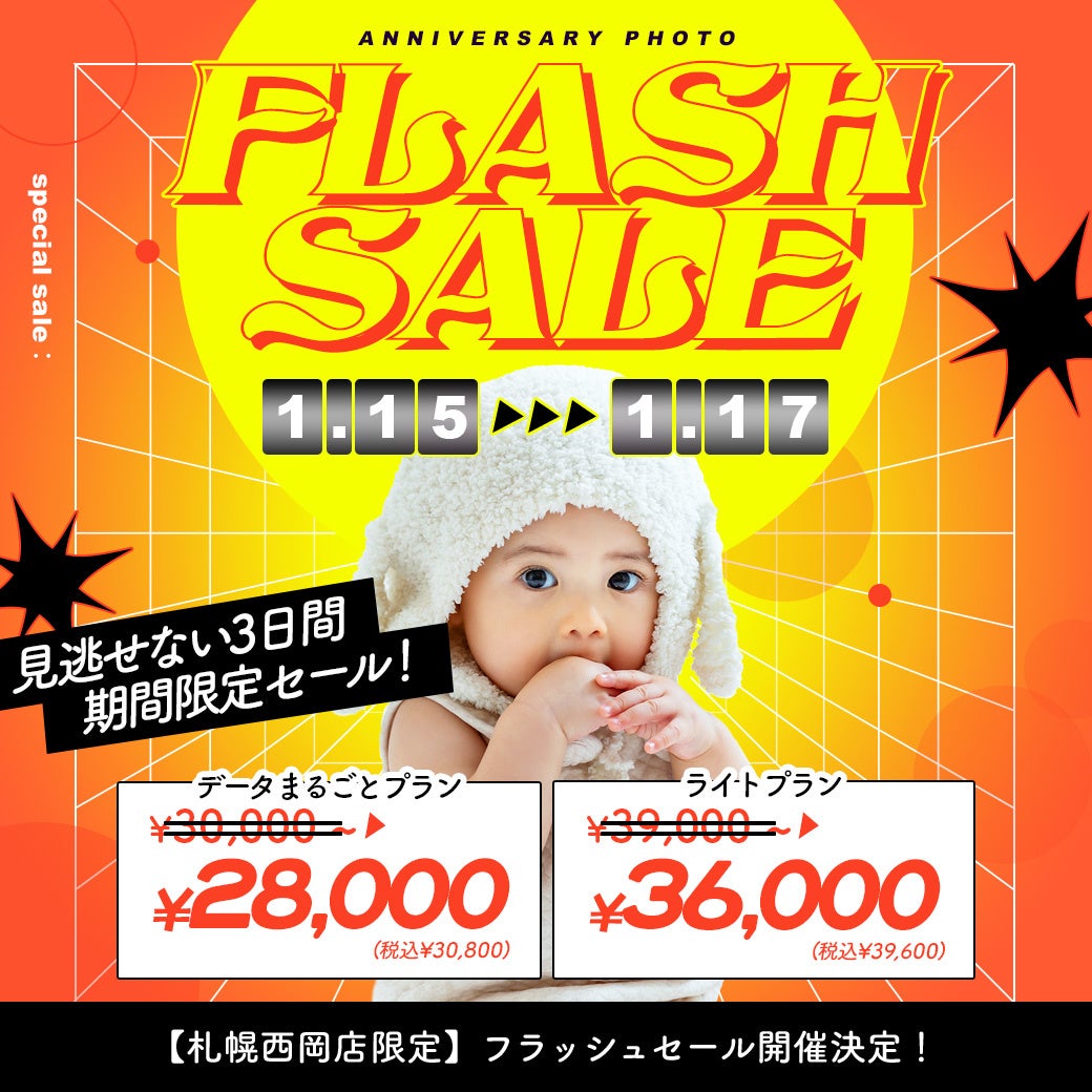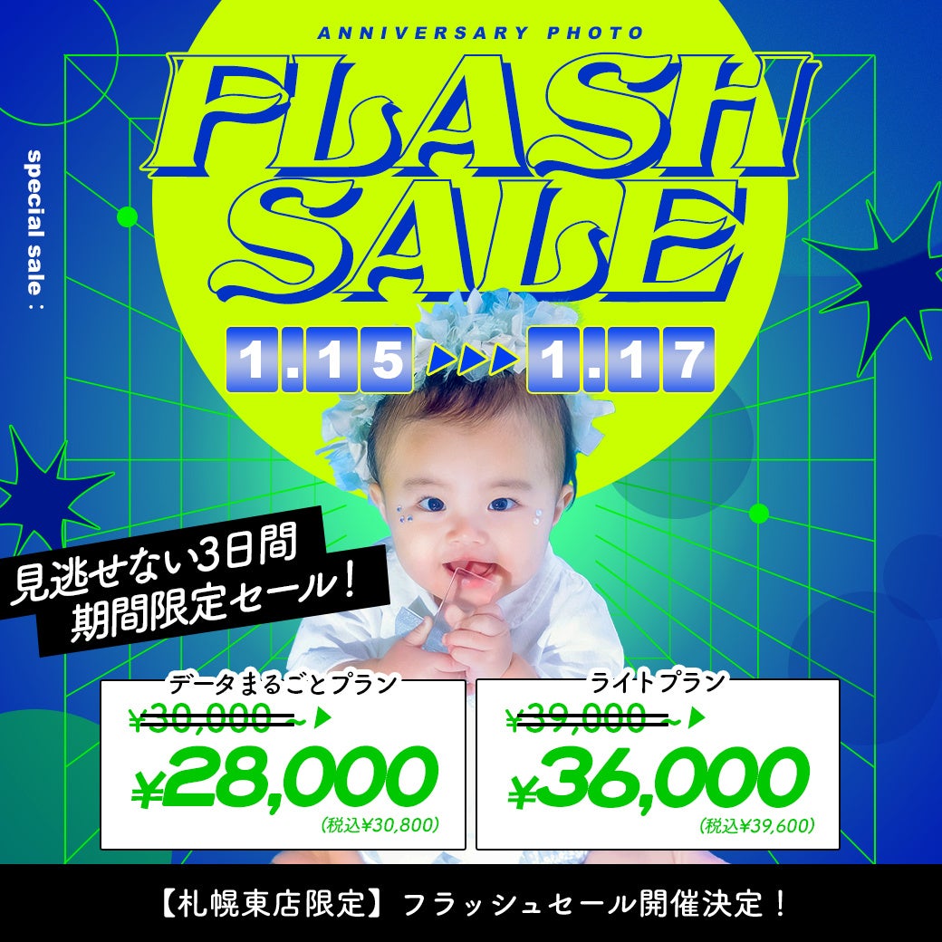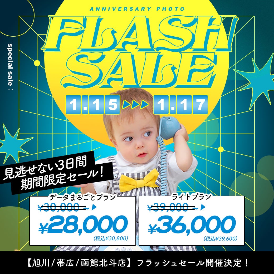 写真スタジオにおける「質」と「価格」のバランスに新しい選択肢を提案し続ける、有限会社三景スタジオ(本社:北海道旭川市、代表取締役:大西康弘)。この度、運営する「写真工房ぱれっと / Palette+plus」の一部店舗にて、2026年1月15日(木)から1月17日(土)までの3日間限定でお得なフラッシュセールを開催いたします。