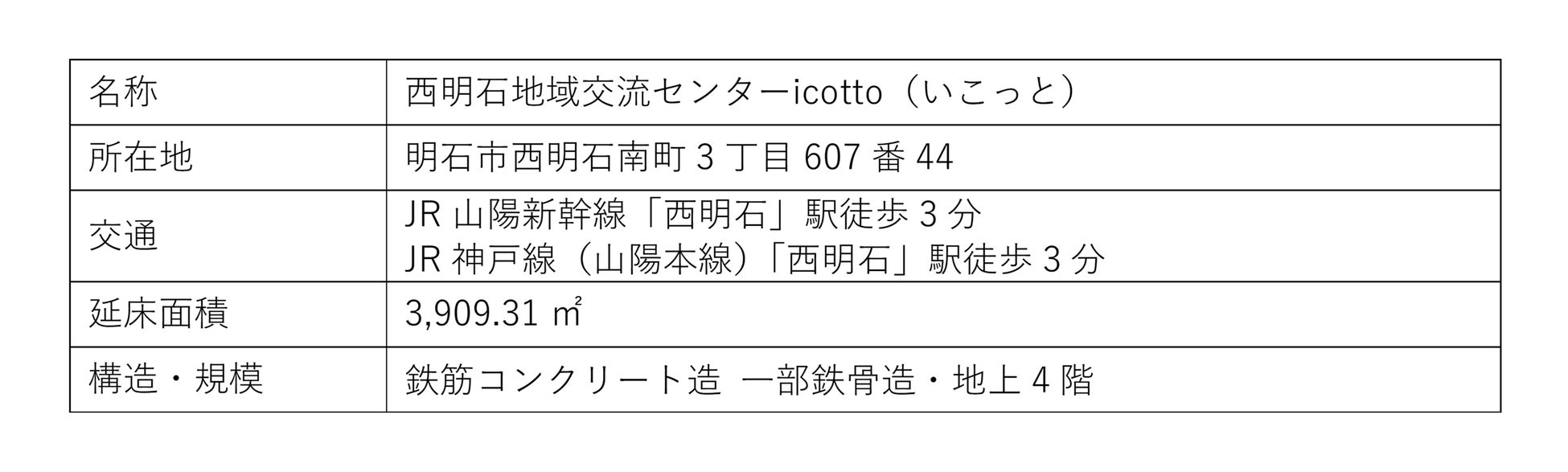 サンライフ明石のリニューアルとして、新たに整備するアクセス道路の西側に西明石地域交流センターicottoを整備します。「本と出会い、人とつながる交流の場」をコンセプトに、現在の機能を発展させつつ、新たに「本のまち明石」を推進する図書コーナーや自習室、地域交流スペース等を加えます。