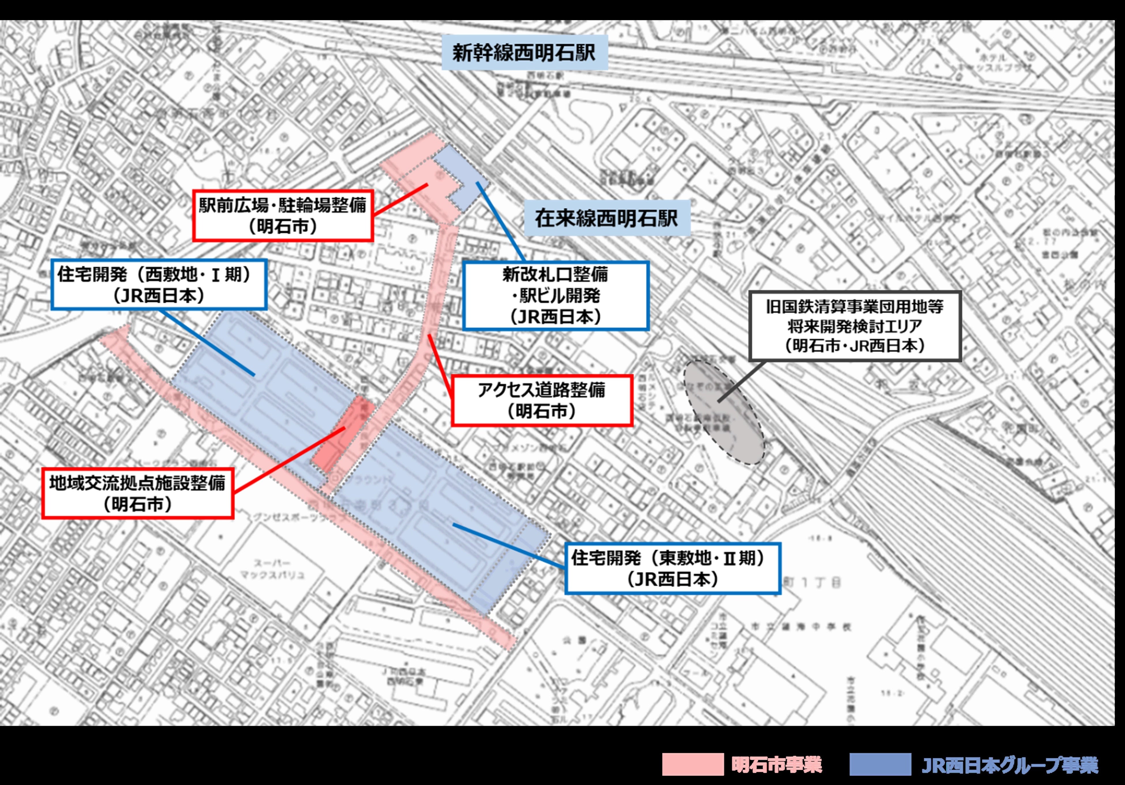 今後は、「JR西明石駅及び駅周辺の安全性と利便性の向上」「地域交流拠点の充実」に向けて、駅及び駅前空間の整備やJR西明石社宅用地での地域交流拠点整備及びマンション開発、駅とまちをつなぐアクセス道路の整備にそれぞれ順次着手していくほか、旧国鉄清算事業団用地でのまちづくりや、地区全体の持続的なエリア価値向上に向けた取組みを共同で検討・推進していく予定です。