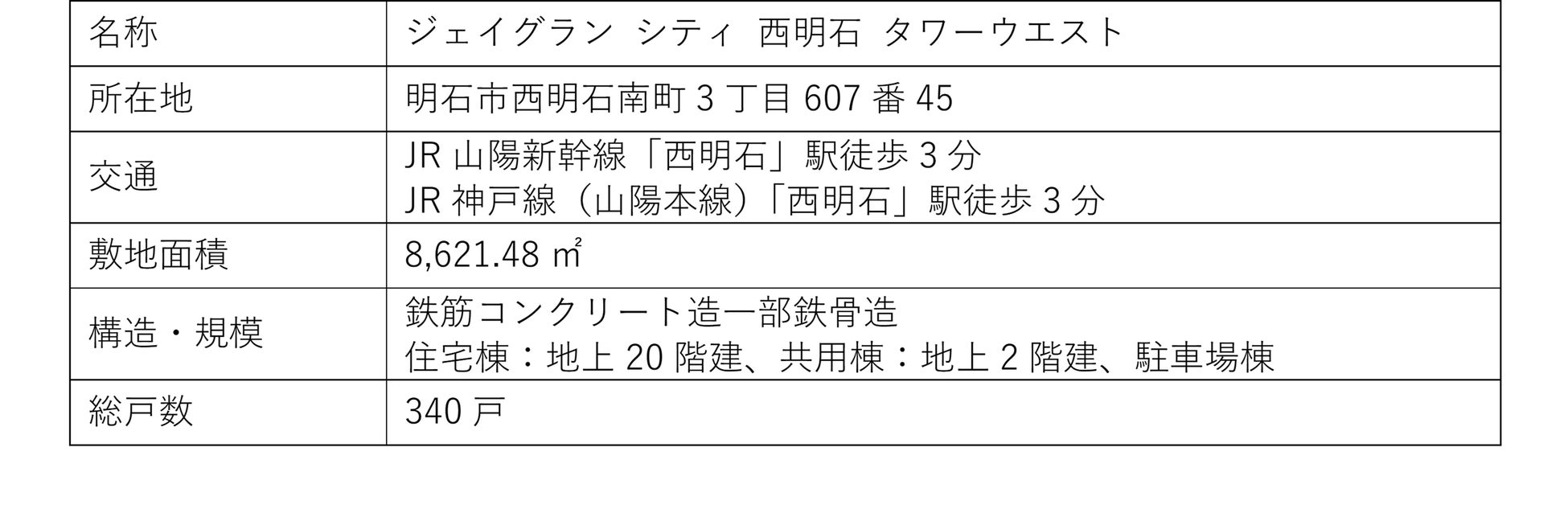 JR西明石社宅用地の西敷地(Ⅰ期)に大規模な新築分譲マンションを開発します。コンセプトは「子育ての充実化×のびやかな暮らし×オープンコミュニティ」。西明石駅徒歩3分の立地で、JR神戸線の新快速や山陽新幹線の停車駅である西明石ならではの「鉄道・新幹線のある暮らし」を提供します。マンション共用部分にはコミュニティラウンジやパーティルーム、キッズスペースを設けるなど、マンション住民同士のコミュニティを育む計画となっています。
