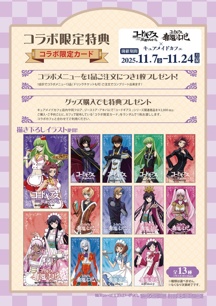 キュアメイドカフェ店内や同フロア、ジーストア・アキバ、同ビル1階グランエンタスにて『コードギアス 』シリーズ関連商品を2,000円(税込)ご購入・ご予約ごとに、カフェで配布しているコラボ限定カードをランダムで1枚お渡しします。