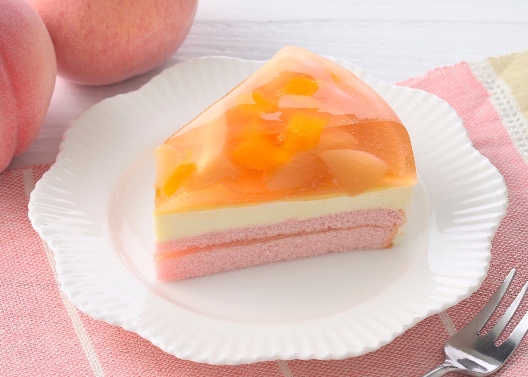 みずみずしいゼリーと口どけなめらかなムース、ピーチ風味スポンジの3層が楽しめる、爽やかな味わいのケーキです。暑い季節でもおいしくさっぱりとお召し上がりいただけます。