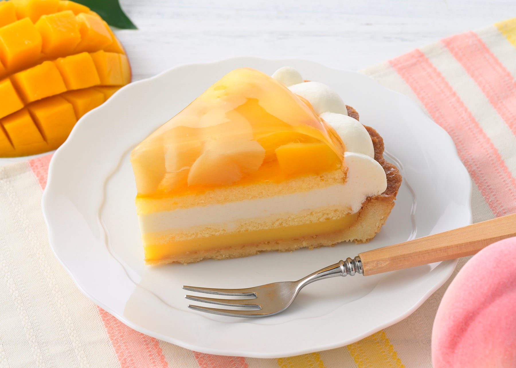 みずみずしいゼリーと白桃ムース、マンゴーカスタードの3層が楽しめる、爽やかな味わいのタルトです。暑い季節でもおいしくさっぱりとお召し上がりいただけます。