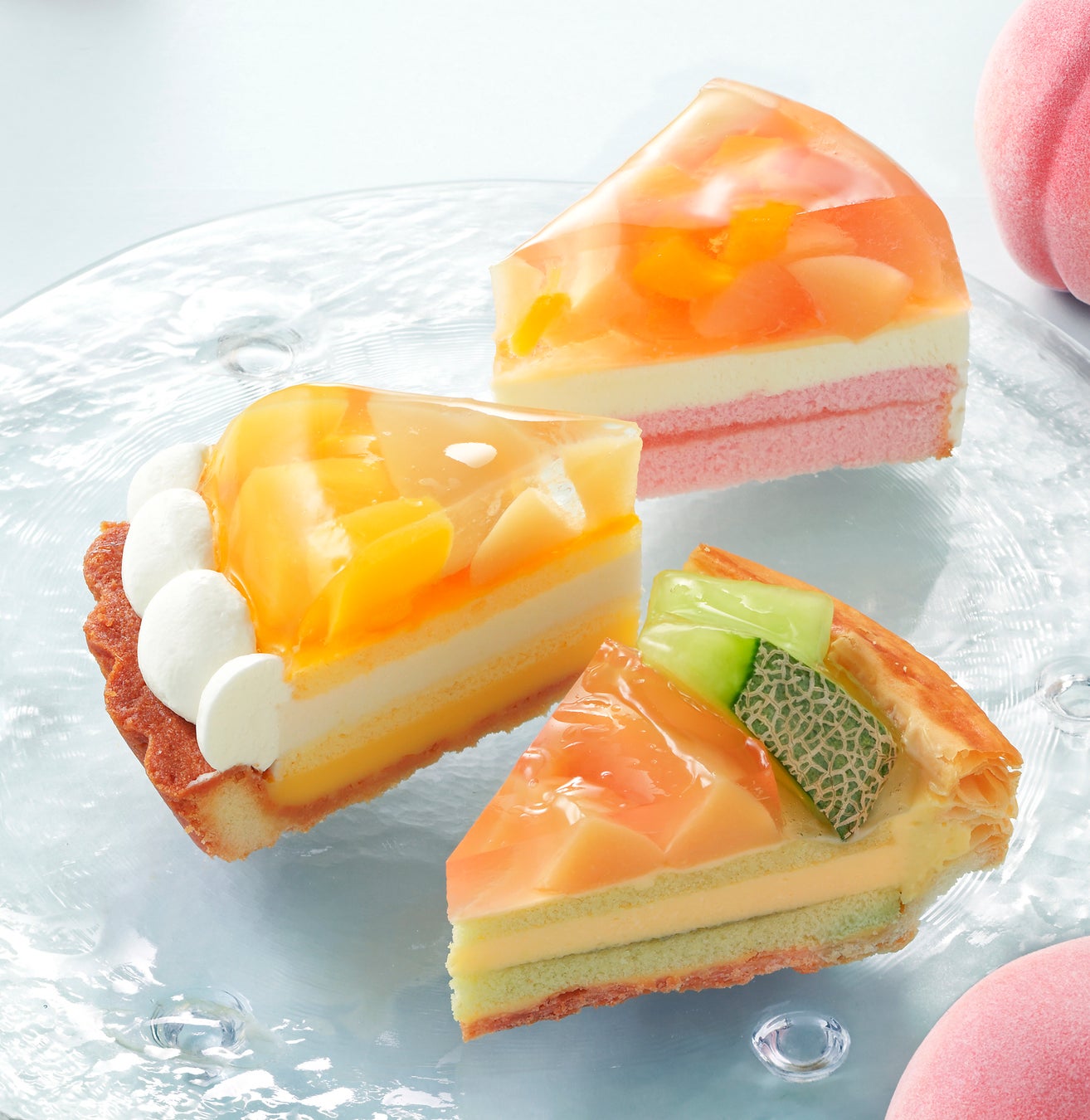 とろける食感、やさしい香りで人気のフルーツ「桃」の季節がやってきました。今年は白桃と黄桃、マンゴー、メロンをそれぞれ組み合わせた3種類のケーキが登場します。
