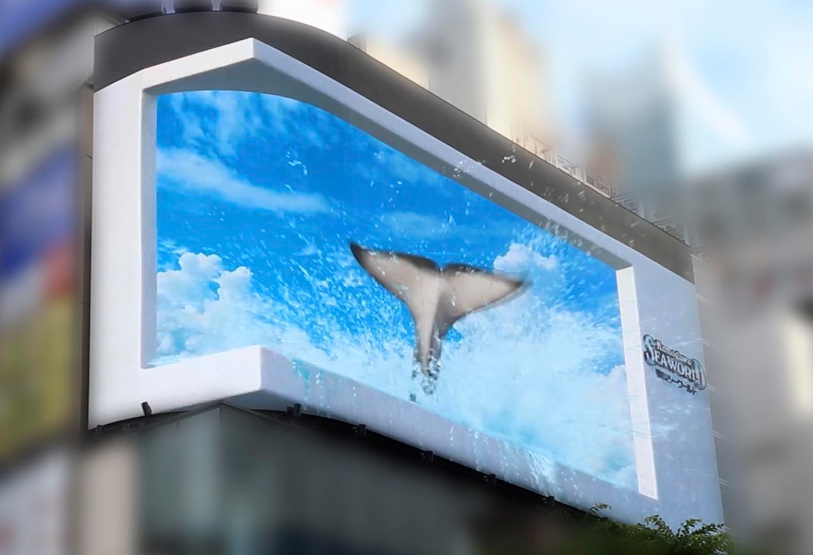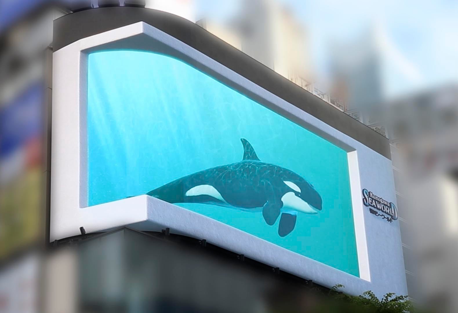 ②クロス新宿ビジョンに掲載されるシャチ「ラビー」の3D広告動画を撮影し、その動画、