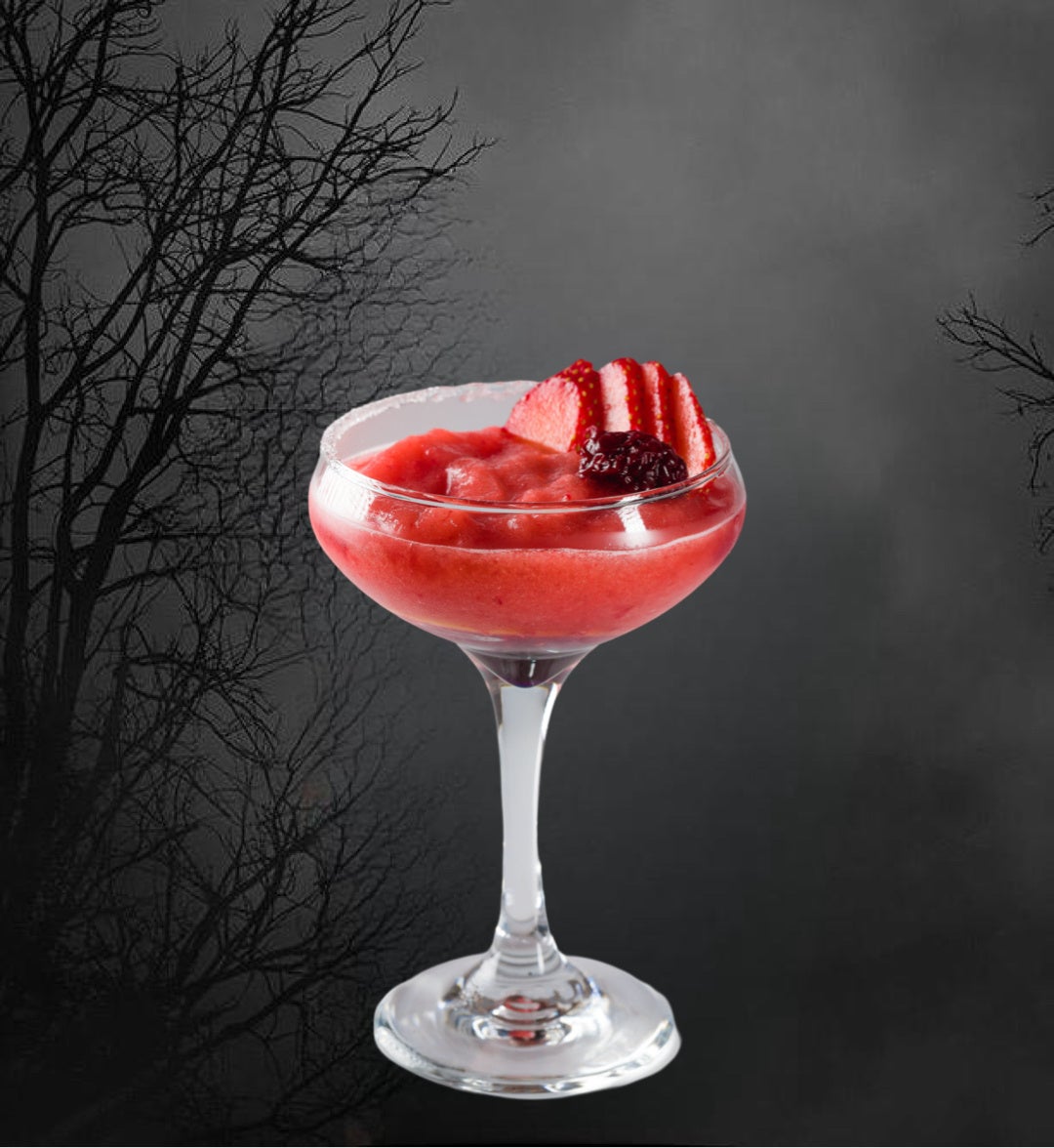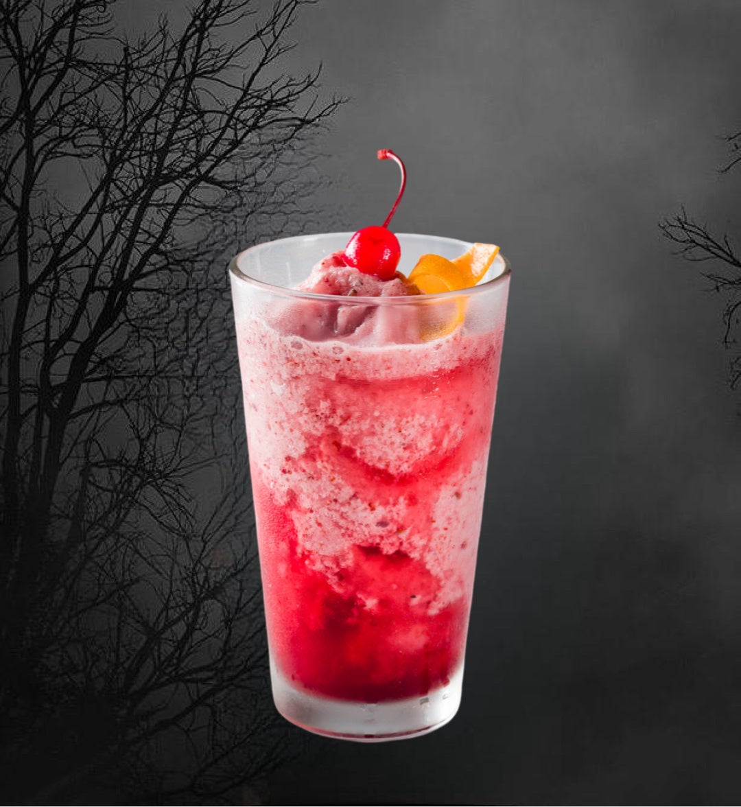 ピニャコラーダミックス、パッションフルーツピューレ、ブラックベリー、アガベサワーのフローズンスタイル。甘酸っぱさとブラックベリーの食感が楽しめます。紫色、ガーニッシュのオレンジとチェリーの赤色がハロウィンを連想させてくれるノンアルコールカクテルです。よく混ぜてからお召し上がりください。Happy Halloween!