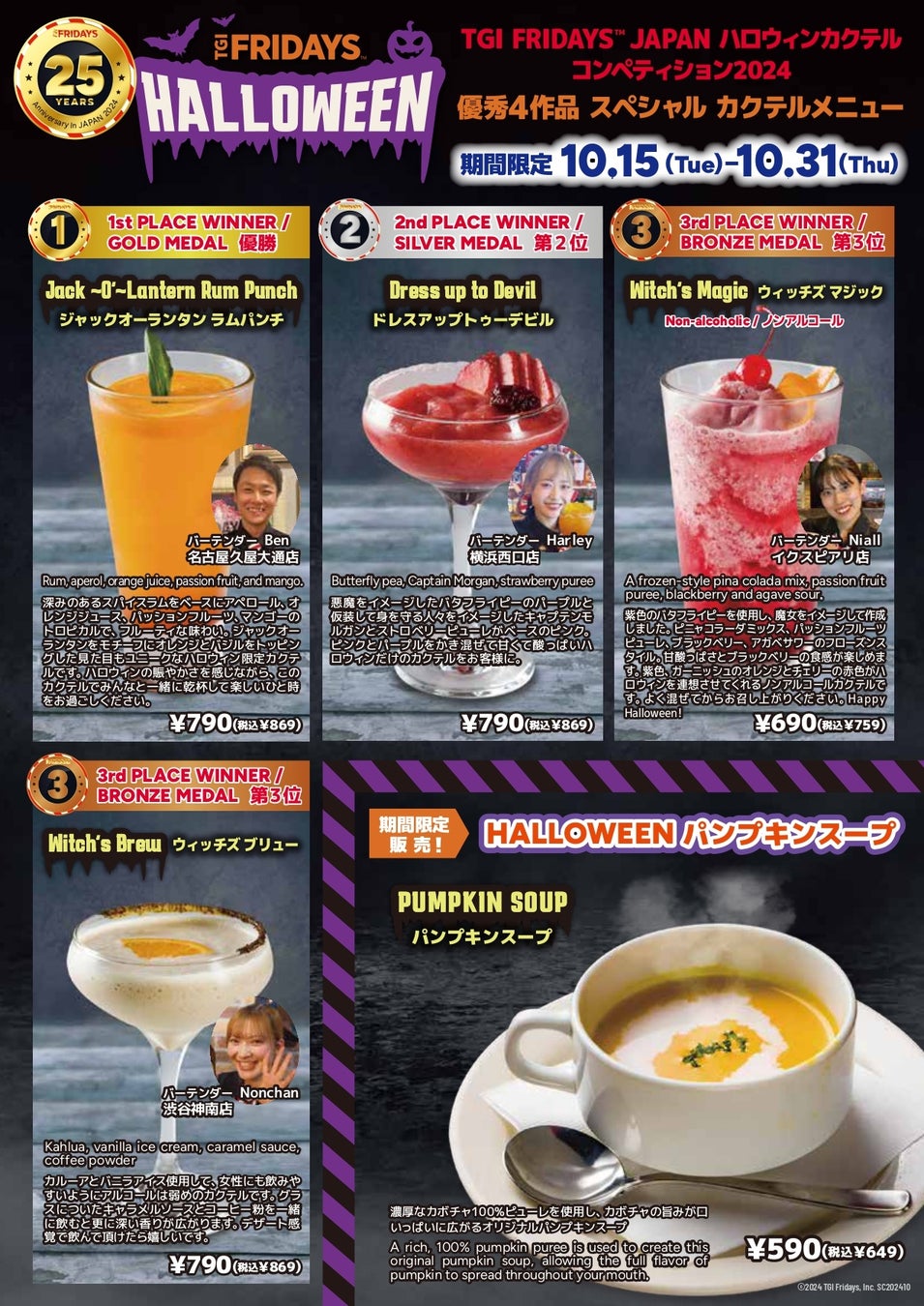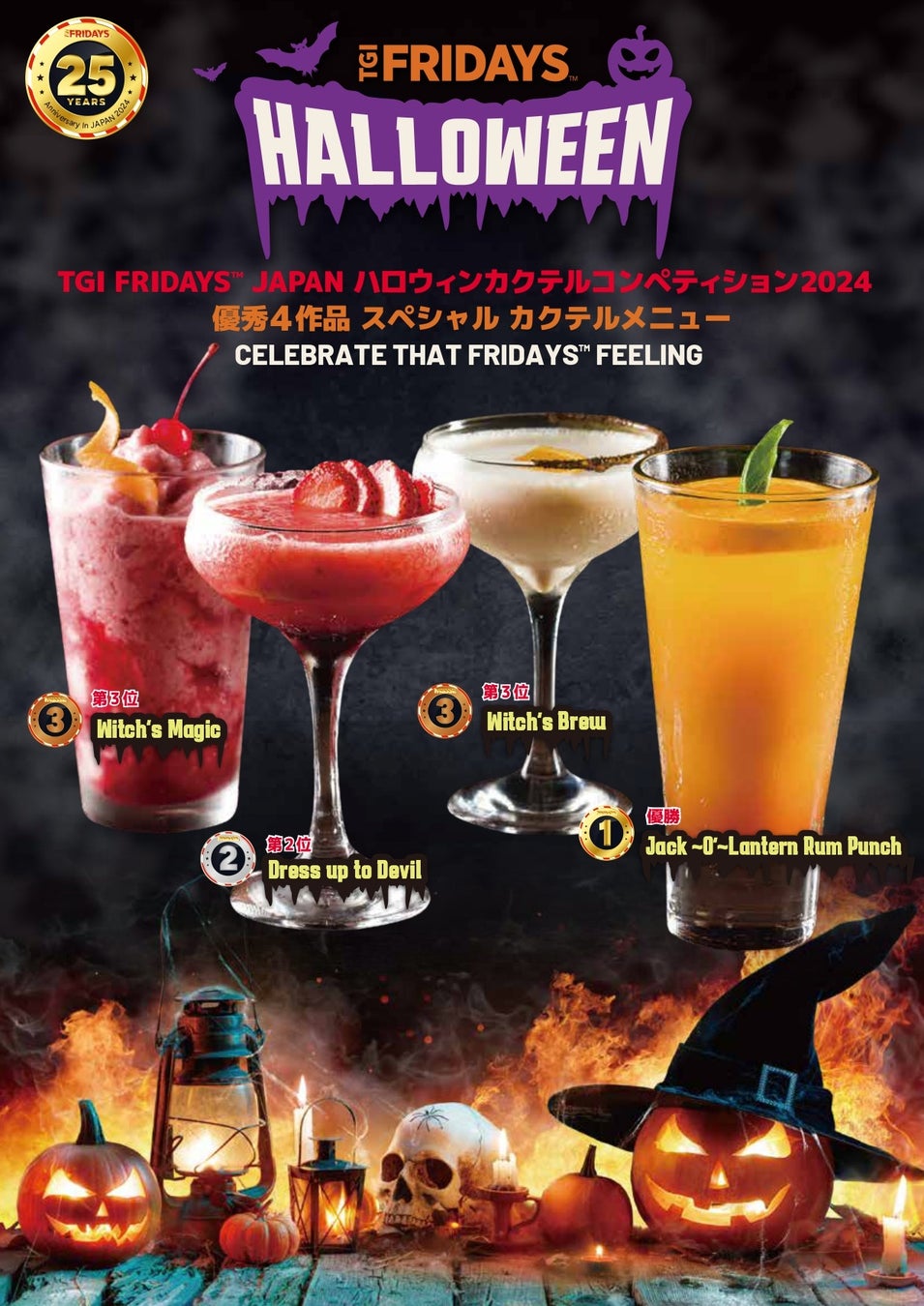 TGI Fridays Japan(本社:東京都大田区/以下:TGI フライデーズ)が運営する世界55か国で850店舗以上を展開する世界最大級のアメリカンカジュアルダイニングチェーン「TGI フライデーズ」は、日本上陸25周年を迎え、 「HAPPY 25th ANNIVERSARY! 特大感謝祭」 の一環として、ハロウィン第二弾 「TGI FRIDAYS JAPANバーテンダーカクテルコンペティション2024」 の優秀4作品を2024年10月15日(火)から10月31日(木)の期間中、販売いたします。また、従業員によるハロウィン仮装コンテストを10月18日(金)~20日(日)、25日(金)~27日(日)、31日(木)で開催いたします。