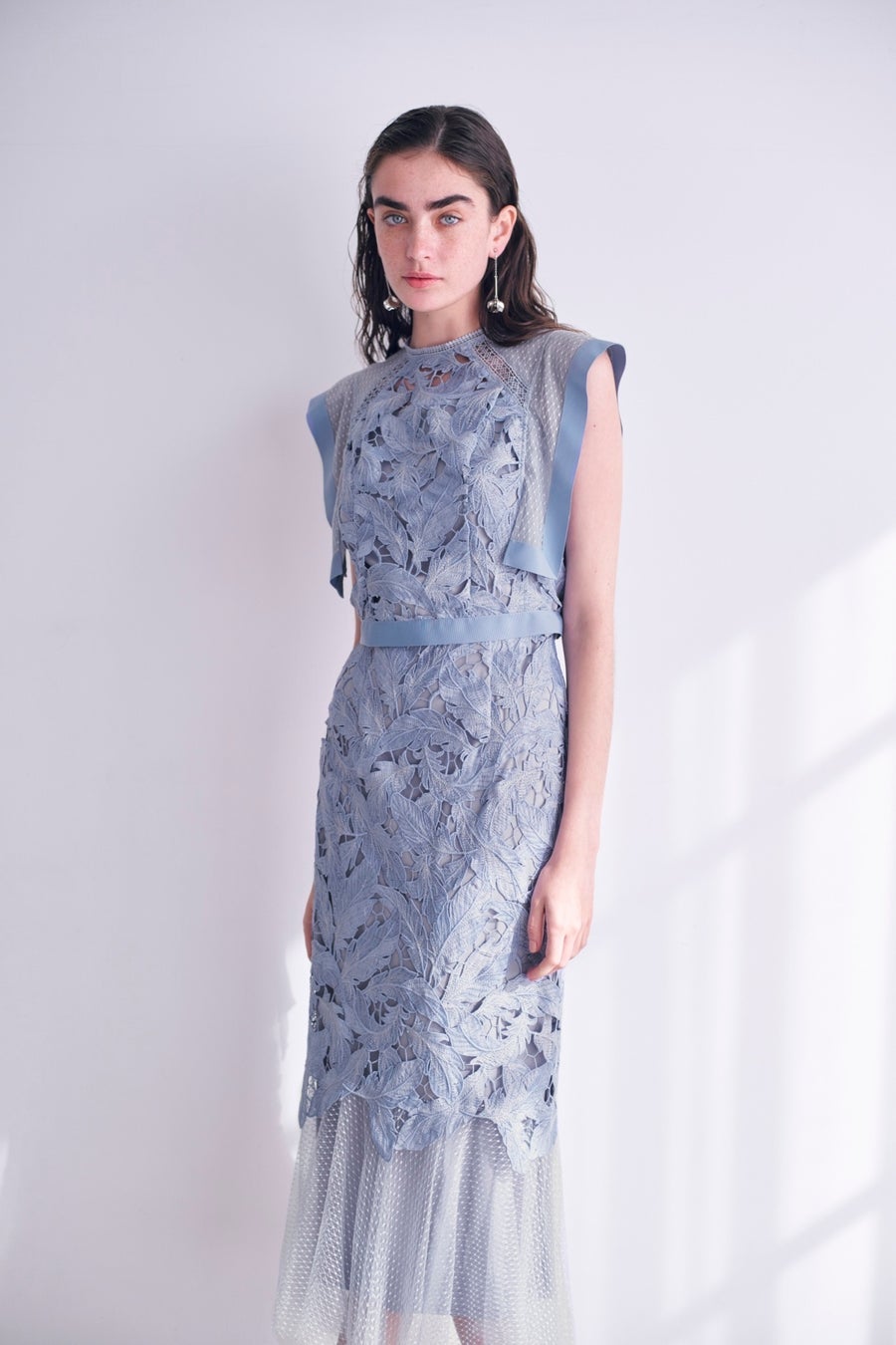 シアーなドットチュールとフラワーレースを重ね合わせた、エレガント&モードなオケージョンドレス。分量感たっぷりに広がるマーメイドシルエットでトレンド感もしっかりとキープ。
