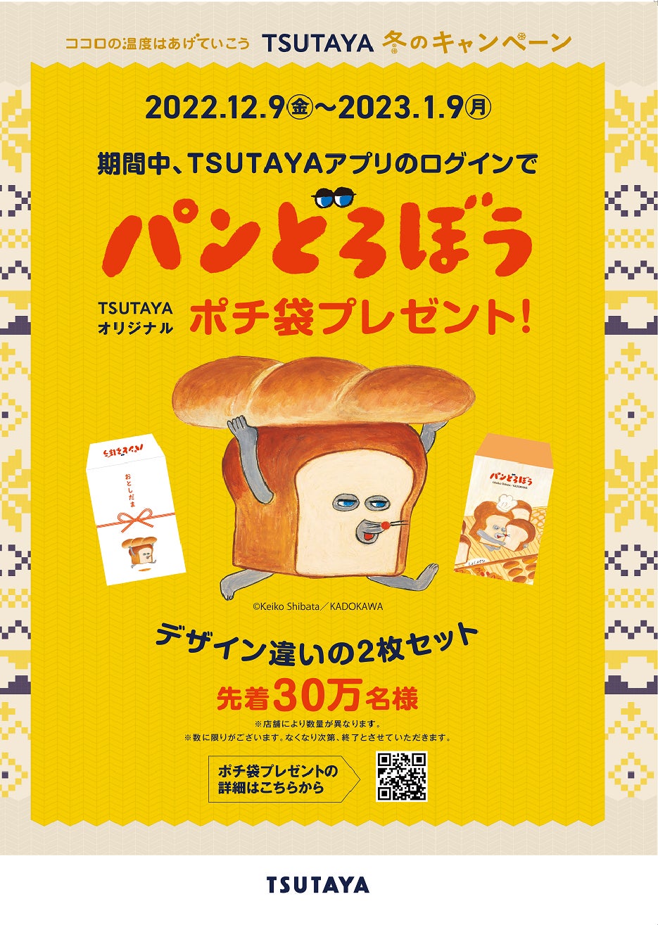 “ココロ”がほっこり温まる、イラストレーター・絵本作家の柴田ケイコによる大人気絵本シリーズ『パンどろぼう』のポチ袋を「TSUTAYAアプリ」にログインすると表示される「引換券」をTSUTAYA店頭で提示いただくと先着で30万名様に『パンどろぼう』のポチ袋をプレゼントいたします。