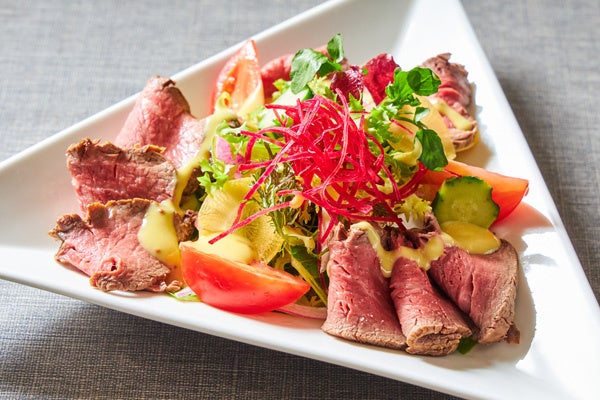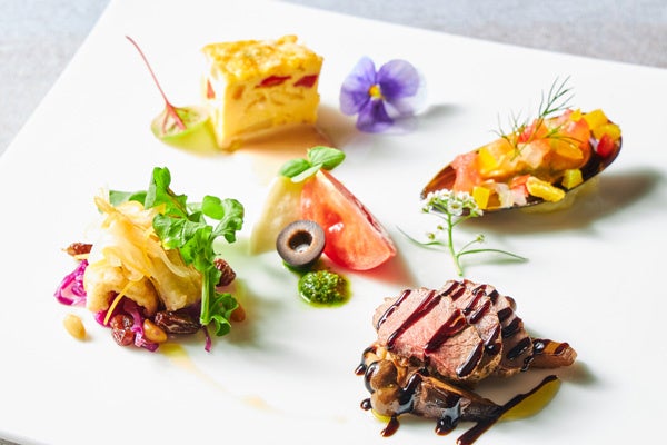 前菜では‟牛肉ときのこのバルサミコ風“や‟ムール貝のマリネ“など5種類の盛り合わせをお楽しみください。選べるメインディッシュはアラカルトメニューより、シェフ自慢の2品をピックアップし、ランチサイズにてご提供いたします。1つ目は「土佐あかうしハンバーグと牛ハラミのグリリアータ ソーセージ添え」。ハンバーグとソーセージに加え、牛ハラミを含めた3種の肉料理を一度に味わえる贅沢な一皿です。2つ目は「黒毛和牛内ももの低温調理 ヴォルケーノ風 オニオンソース」。口の中にジュワッと広がる肉の旨味をお楽しみください。食後には、見た目も涼しげな夏らしいパフェをご用意いたします。みずみずしい桃の果肉や赤桃のアイスと、ミント香る爽やかなホワイトチョコクリームを堪能できる、締めくくりにぴったりなデザートです。