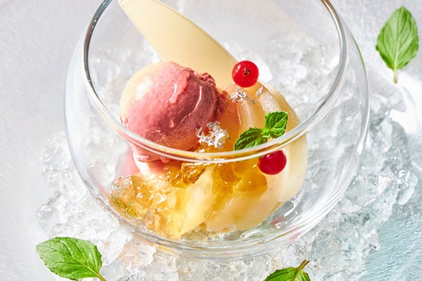 ベルベーヌの爽やかなジュレをまとった桃とミントのパフェ