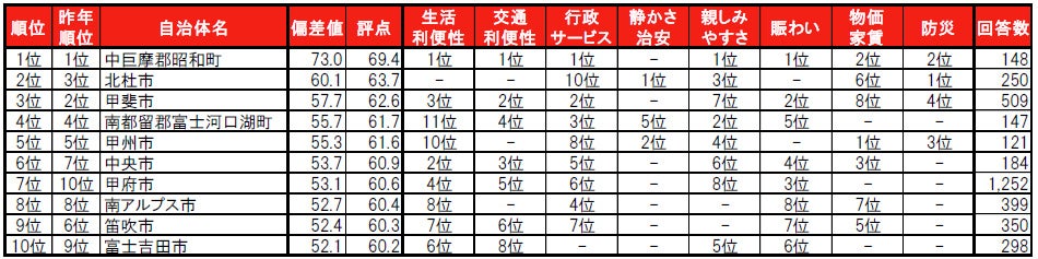 1位は東京23区(4年連続)と同率タイで、「住みここち」で1位の中巨摩郡昭和町が昨年4位から順位を上げてトップに並んでいます。トップ5では、南アルプス市が昨年から順位を上げて5位となっています。
