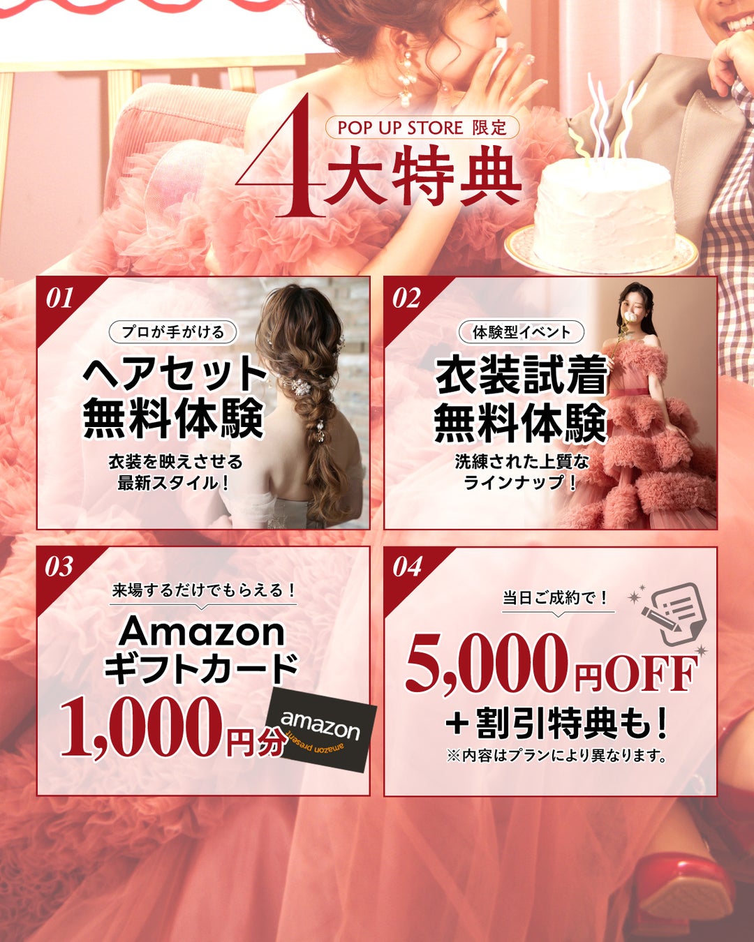 今回のPOP-UPストア最大の見どころは、完全無料の「ヘアセット&ドレス試着体験」です。