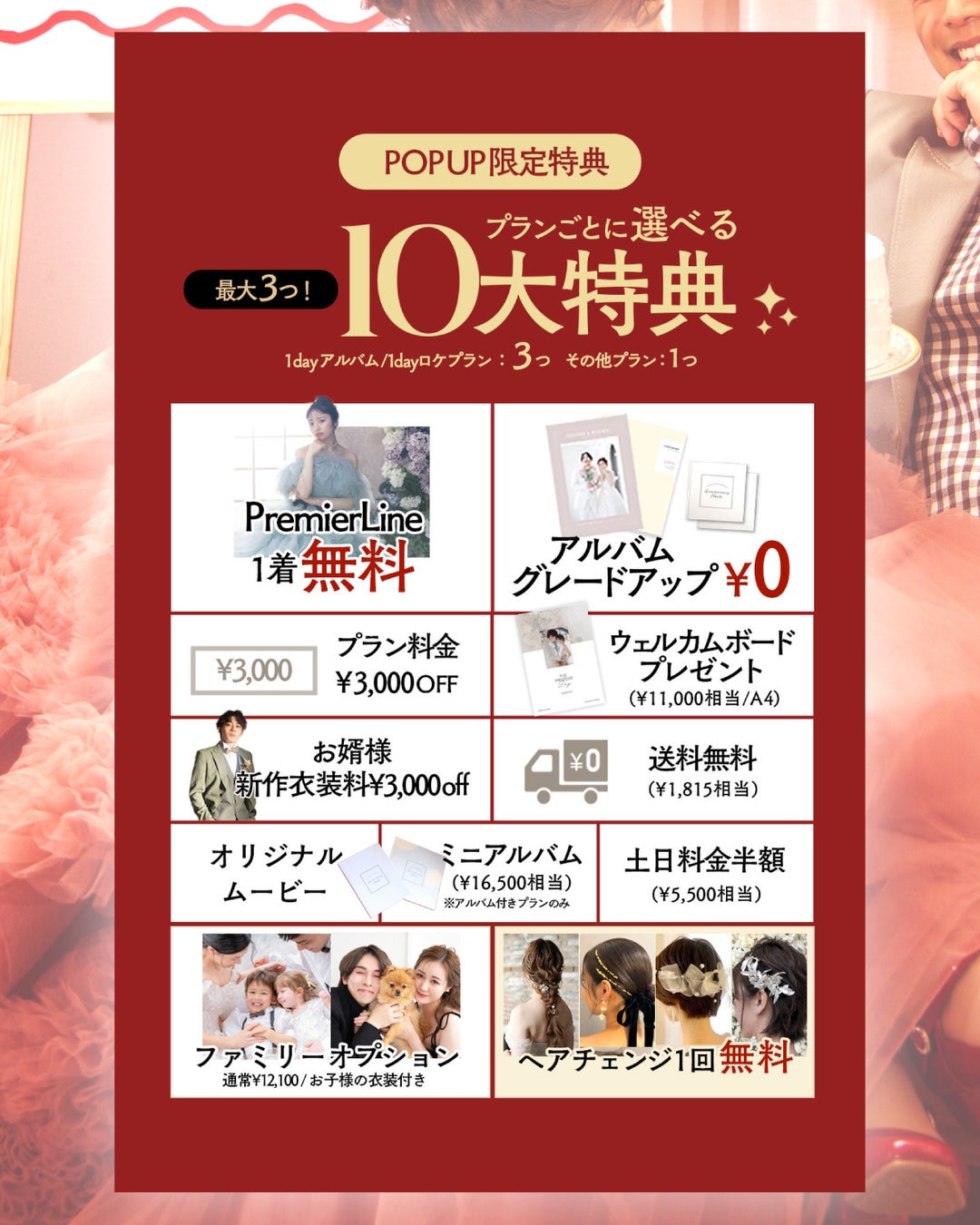 アルバムのグレードアップ(22,000円相当)や、Premier Line衣装1着無料、ウェルカムボードプレゼントなど、豪華な10個の特典から、プランに合わせて最大3つまでお好きなものをセレクト可能。「賢く、贅沢に」叶えたいお二人にぴったりです。