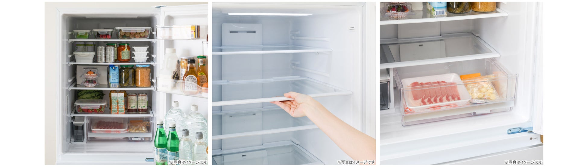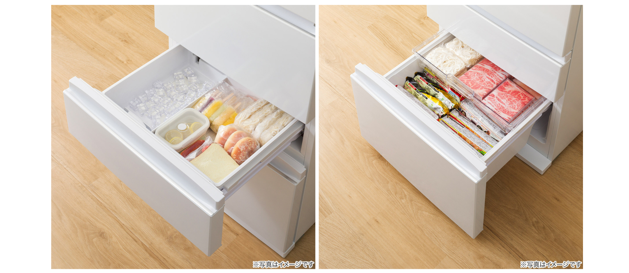 収納しやすい2段引き出し式冷凍室を採用。上段はホームフリージングした食品、下段は買いだめした冷凍食品など、使い分けることで整理がしやすくなっています。