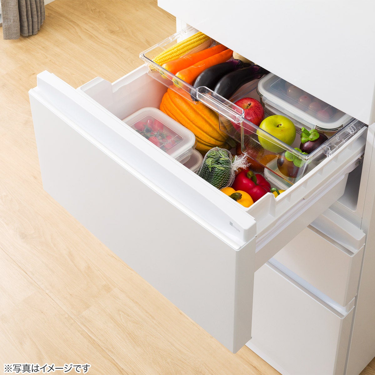 野菜室を真ん中に配置しているため、キャベツなどの重い野菜もかがまずに出し入れできます。2段式で整理がしやすく、野菜を頻繁に調理する方や自炊頻度が高い方におすすめです。