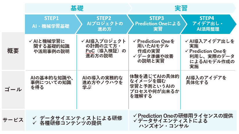 今回のサービスでは、このような課題を解決するために、非専門家向け予測分析ツール「Prediction One」をAI教育のプラットフォームとして提供し、AIやデータ活用に関するハンズオンを行うことで、企業をはじめ官公庁や教育機関などにおける現場のDX推進に貢献します。