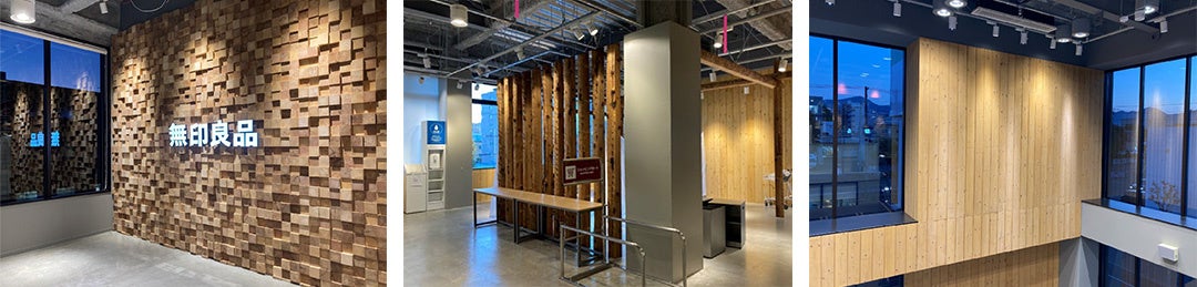 木材を通した地域コミュニケーションや環境配慮の観点から、店内の内装や休憩スペースには北海道産の道南スギ、トドマツを使用して「ロゴサイン」「梁柱」「壁面の仕上げ」を施工しました。この木材は「HOKKAIDO WOOD」※3の認証を受けており、店内では「HOKKAIDO WOOD」の紹介パネルも展示いたします。