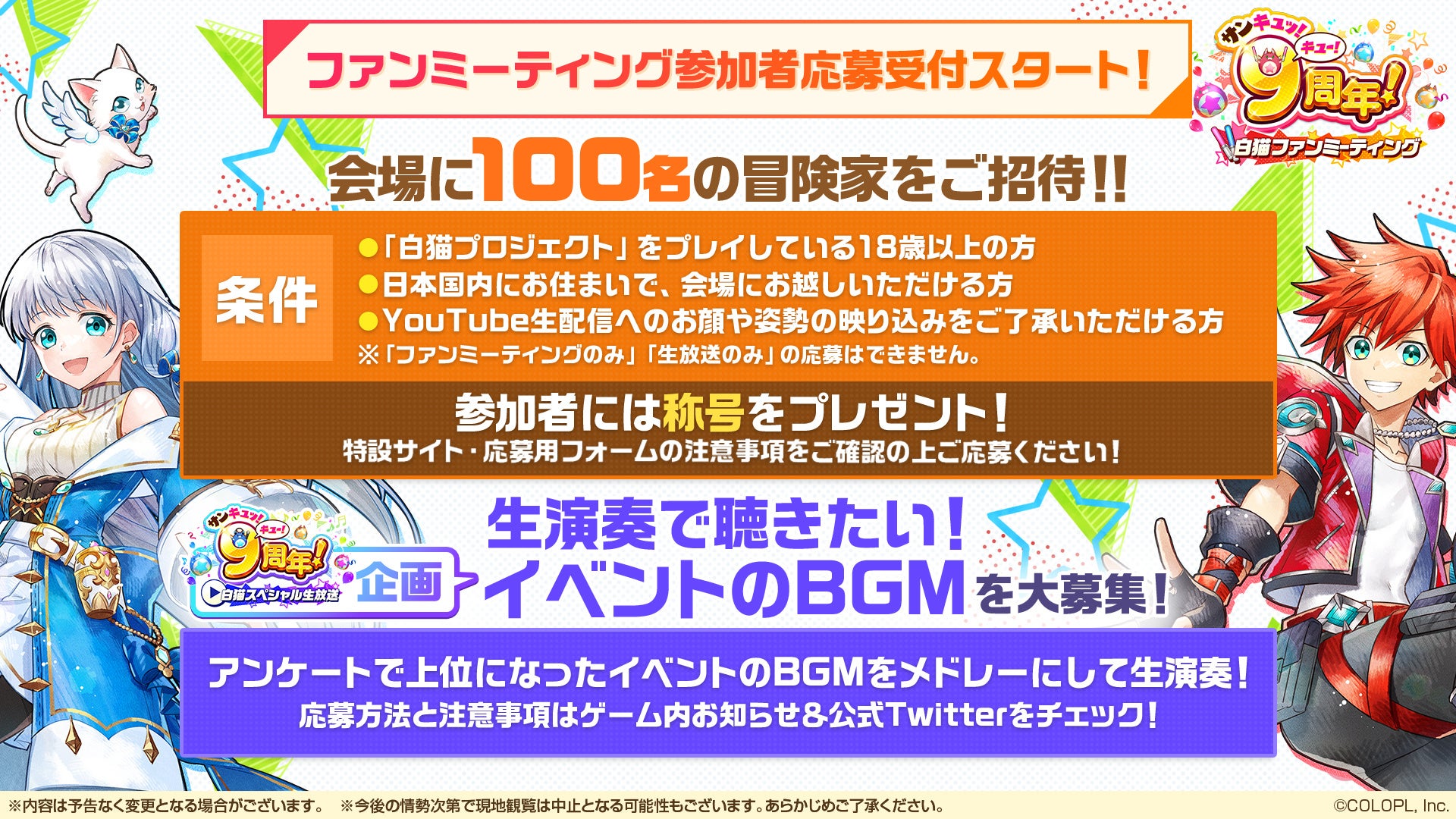『白猫』9周年を前にみんなで楽しむファンミーティングの参加者応募を現在受付中です。