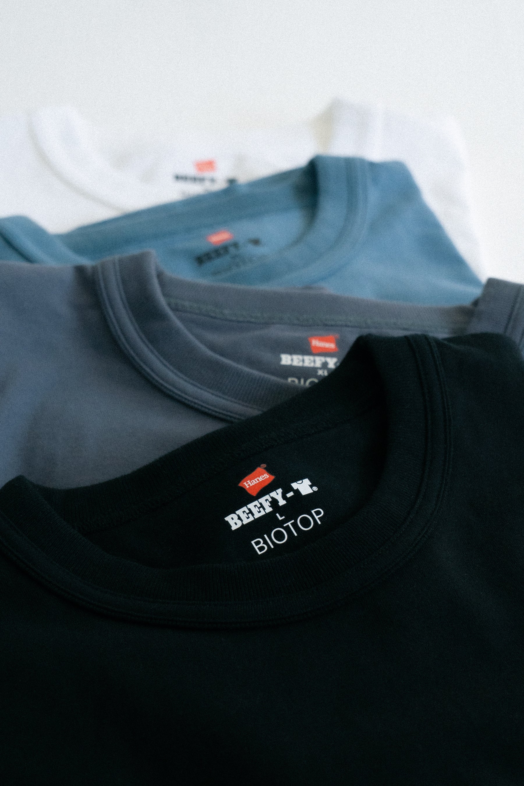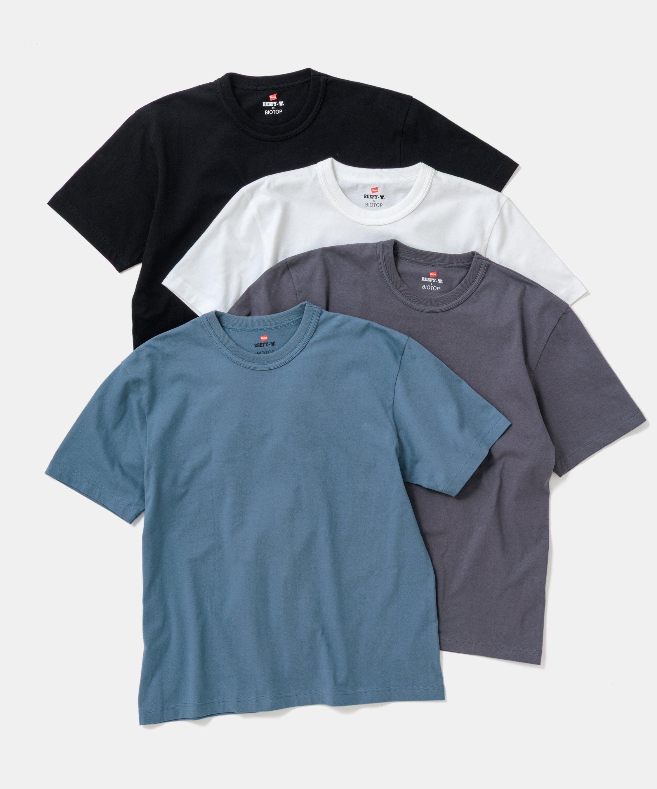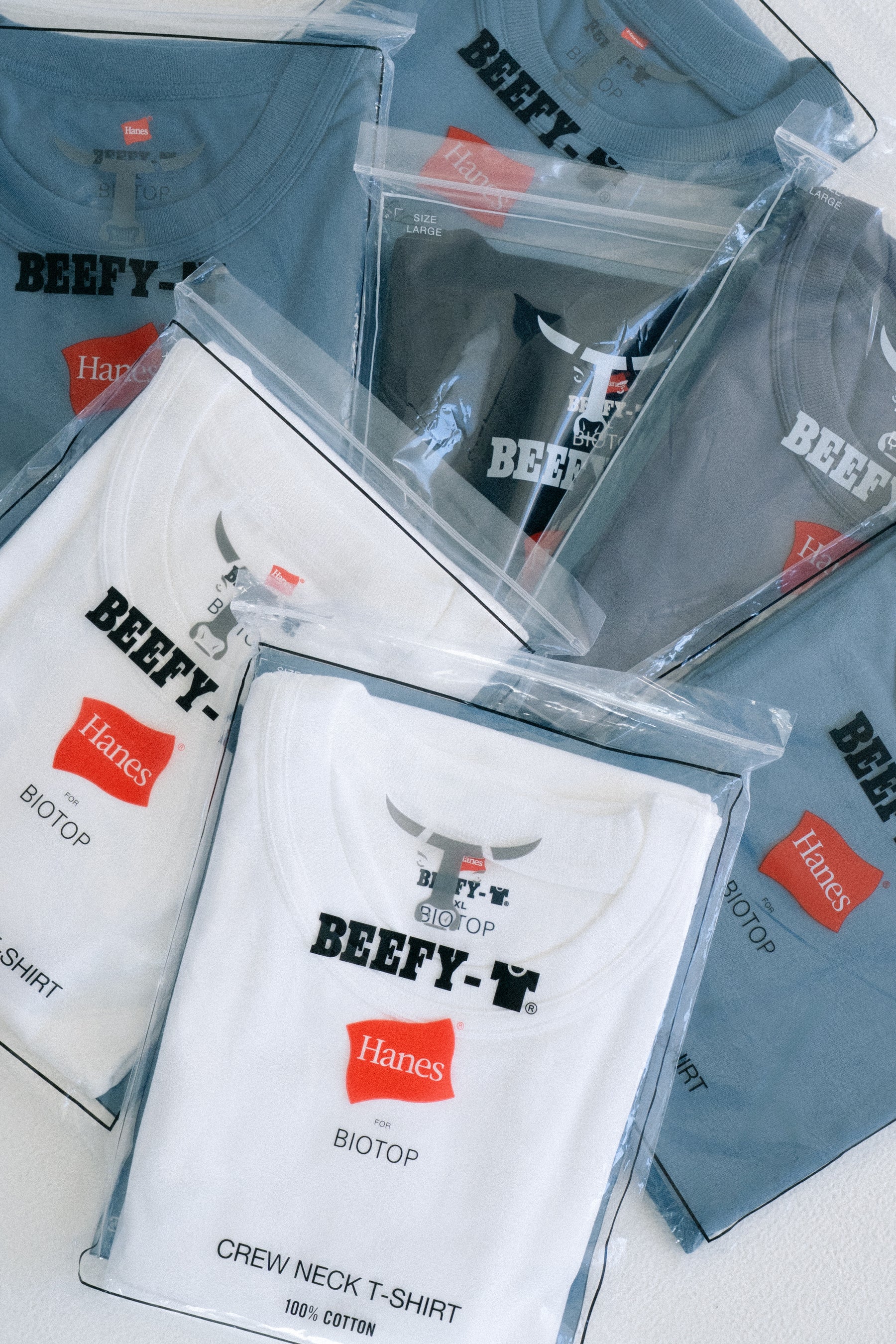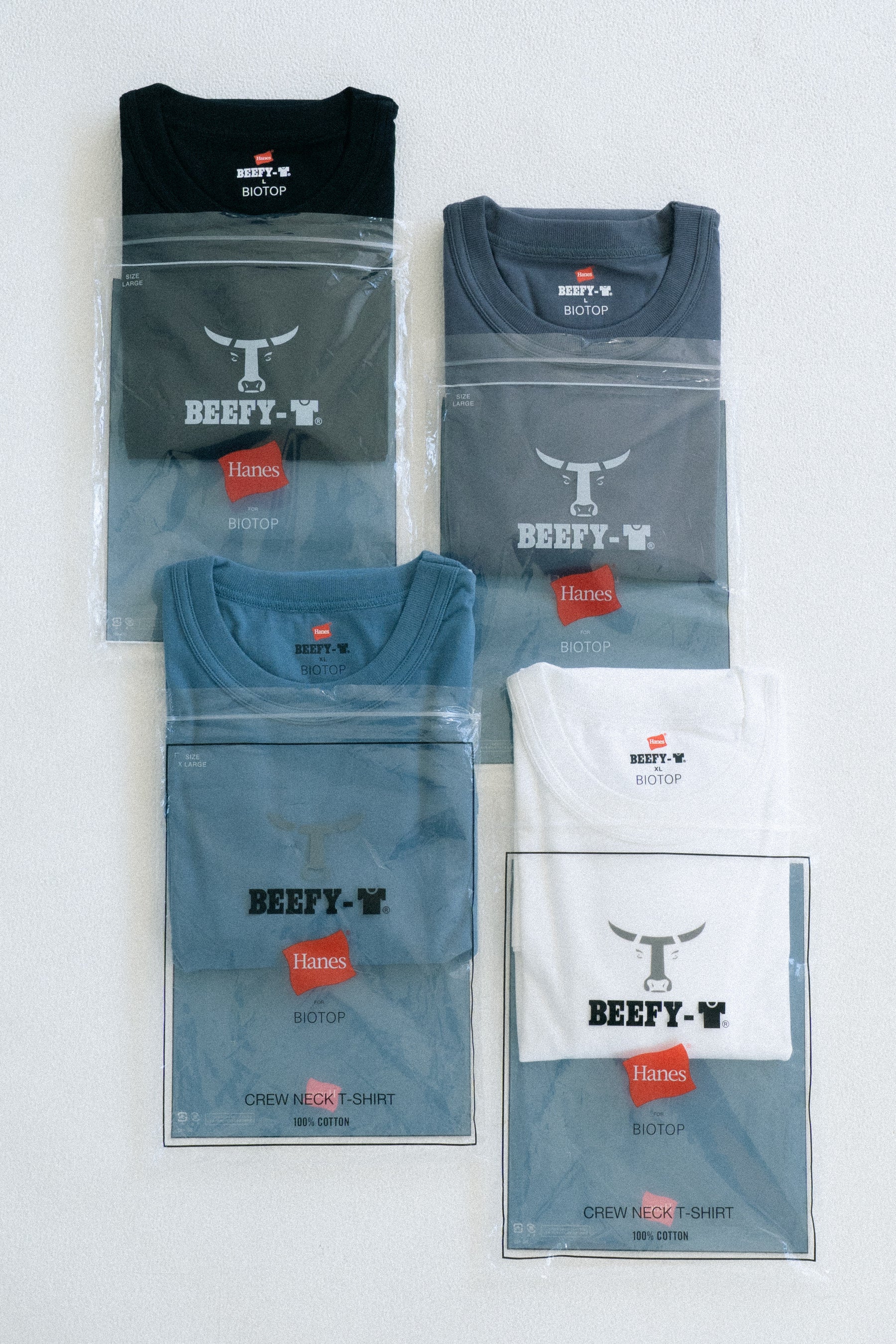 ヘビーウェイトTシャツの代名詞であると同時にHane 屈指のシグネチャーモデルとされる、6.1オンスのBEEFYコットンジャージー (天竺) 生地をセレクト。