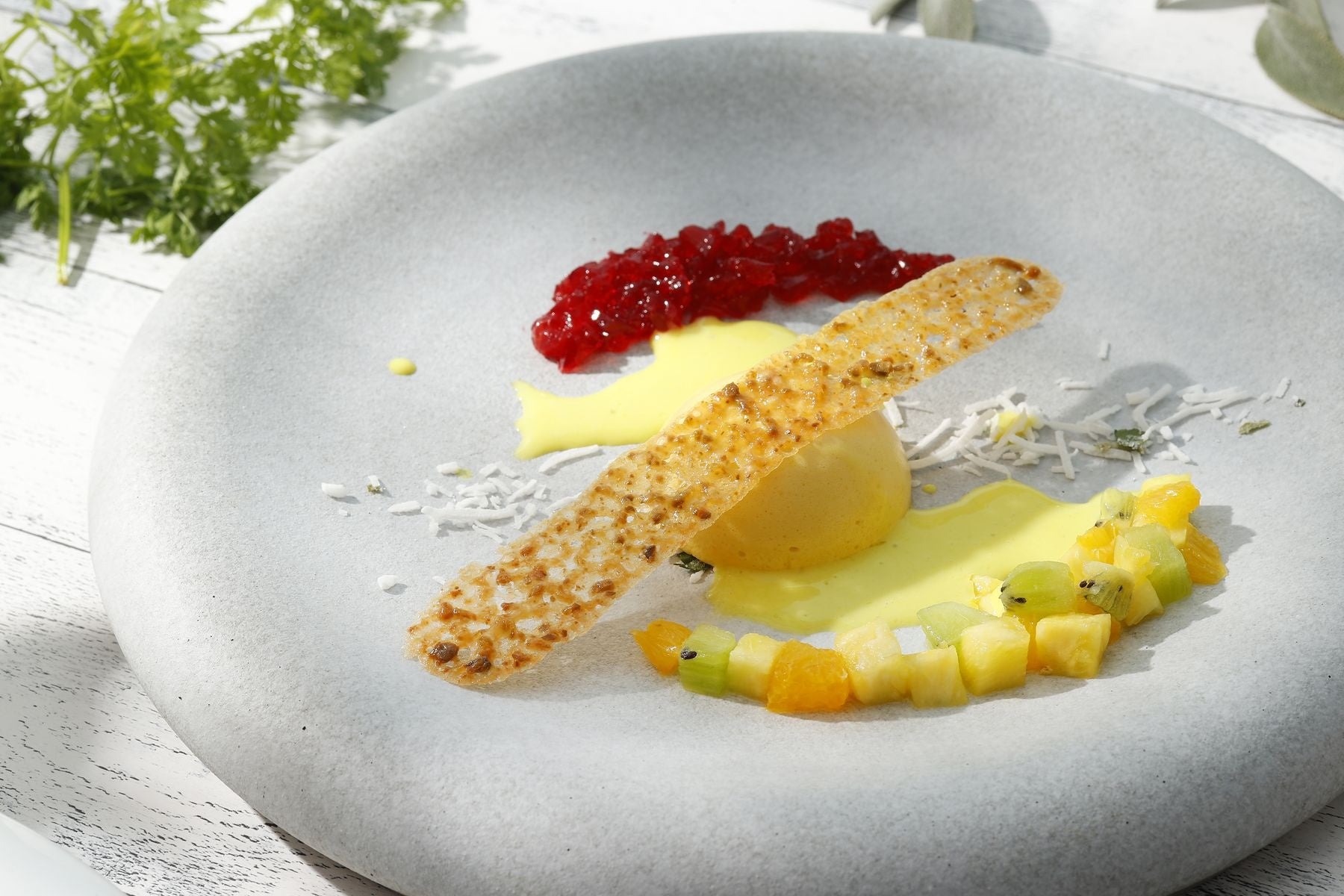 沖縄県産マンゴーのパルフェ オレンジミント香るココナッツソース