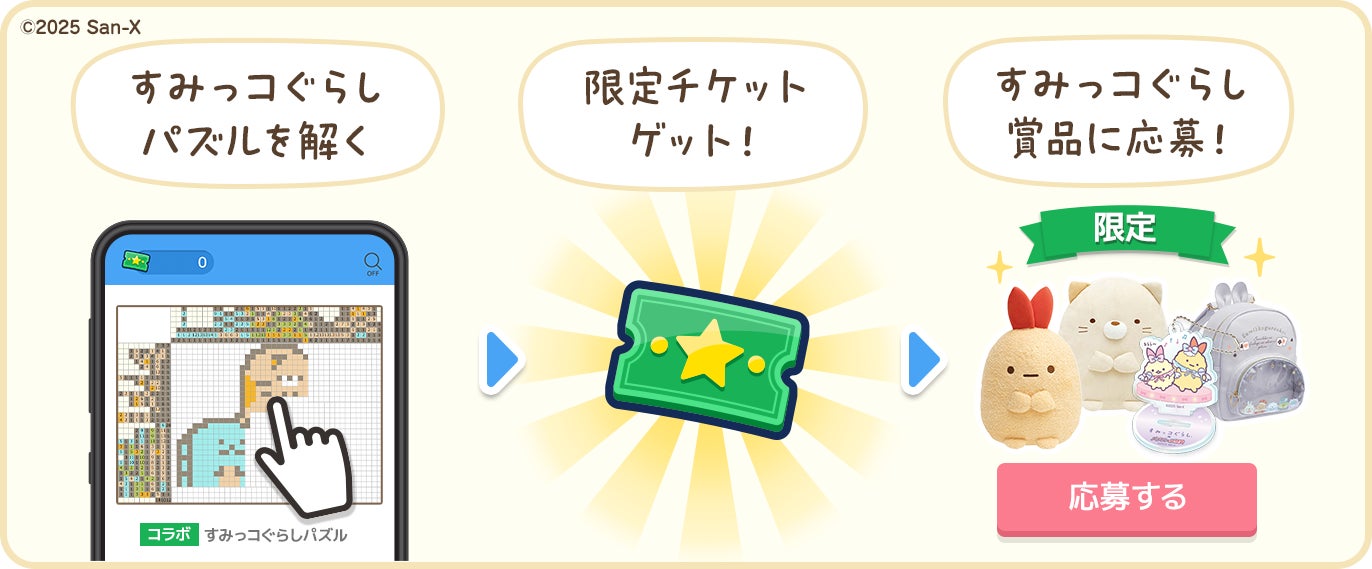 「ロジックde懸賞」アプリ内でコラボパズルをクリアすると、限定チケットを獲得できます。集めたチケットで「すみっコぐらし」グッズが当たる懸賞に応募できます。