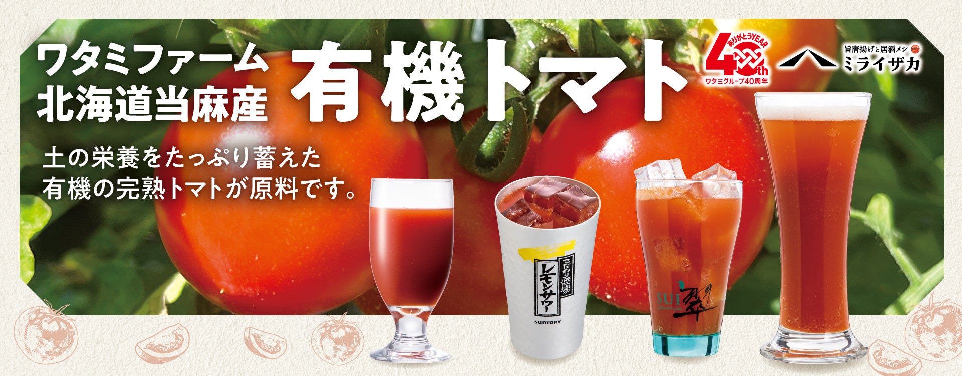 ワタミファームでは創設の2001年から有機農業に取り組んでおり、土壌の持つ本来のチカラを引き出した滋養あふれる野菜作り、環境負荷の少ない土づくりに取り組んでいます。北海道当麻では、「有機トマト」を100%使用したトマトジュースを製造しております。夏のイメージが強いトマトですが、実は高原野菜で高温多湿を苦手としているため、北海道当麻のトマトは秋から冬にかけて、昼夜の寒暖差によって甘みがしっかり蓄えられます。そんなこだわりの詰まった濃厚有機トマトジュースを、そのまま味わうのはもちろんのこと、人気のドリンクとコラボし「こだわり酒場のトマトレモンサワー」「翠ジントマトソーダ」「濃厚トマトジュースのレッドアイ」として期間限定で提供します。